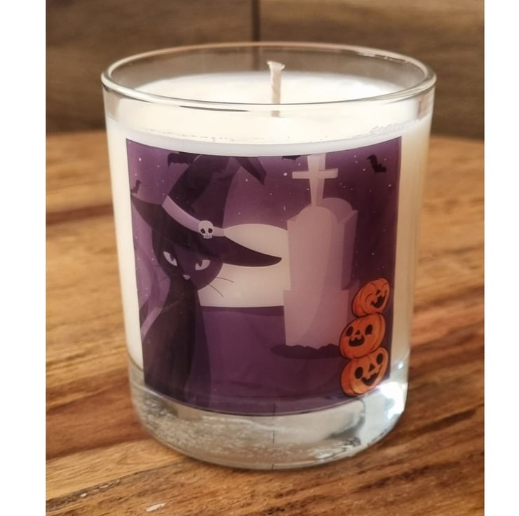 A scented candle for Halloween featuring a black cat design. Handmade with love in Barton Seagrave, Northamptonshire using a high quality mineral and rapeseed wax blend, the finest range of premium fragrances, hand-poured into quality glass containers and supplied in a kraft box.