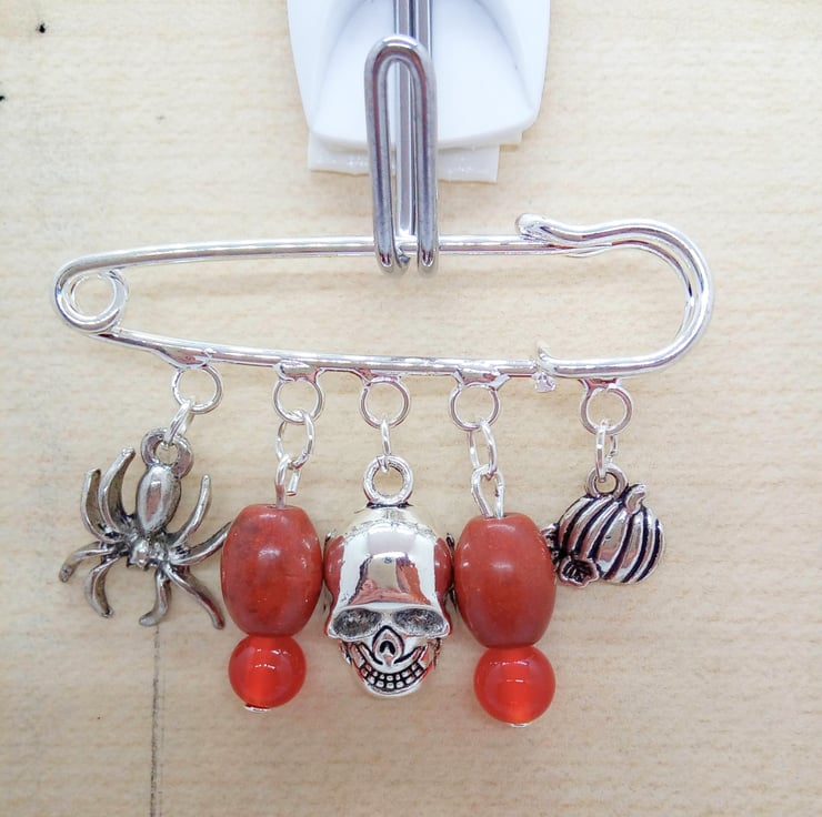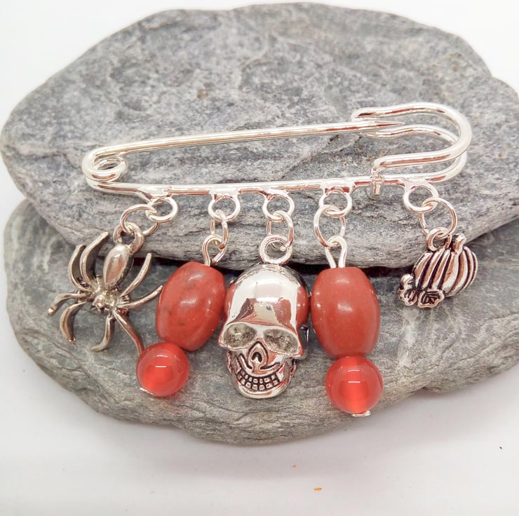 Kilt Pin with a Spider Skull and Pumpkin Charms and a Brown and Orange Charms, Birthday Gift, Gift for Her, Halloween Gift, Novelty Brooch, Halloween Brooch