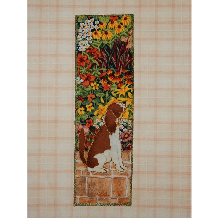 This cute brown and white dog is sitting on the garden path, he seems to be smelling the flowers, which are very pretty. The bookmark measures 2.5 x 8 inches, and is made from cotton print fabrics with the dog appliqued on. The edge is stitched in variegated green thread. There is a layer of stiffening and a plain fabric back.
