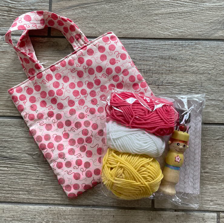 A handmade padded fabric bag made in high quality pink cotton fabric decorated with balls of wool. The bag is fully lined. Inside is a knitting dolly with full instructions and 3 balls of wool. Dimensions of bag excluding handle 8.5 x 8.5 ins.