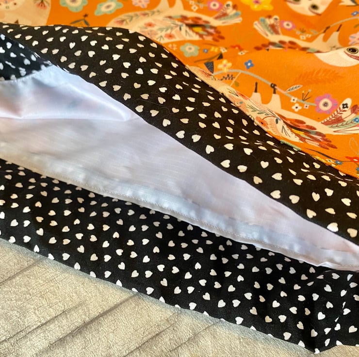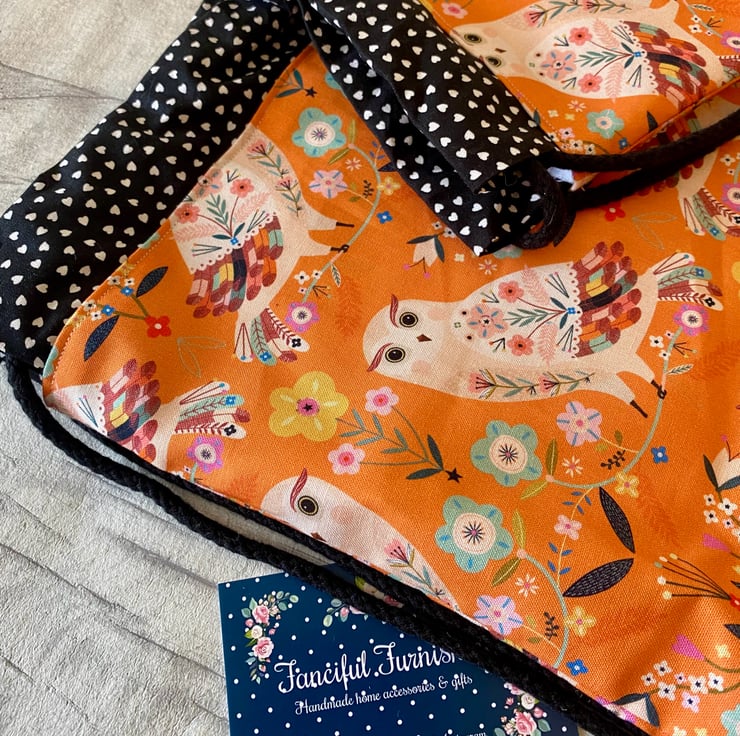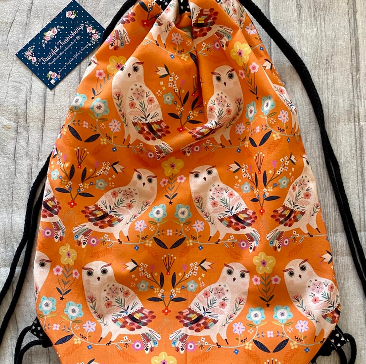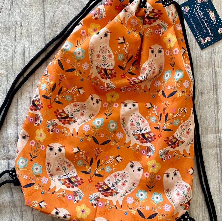 Child’s drawstring backpack in this beautiful owl themed fabric. This lovely fabric is 100% cotton so feels great. I’ve lined it with a water resistant rip stop fabric making it perfect for school trips, days out, pump bags, PE kits, swimming bags, taking your favourite toys to Grandma’s, etc. They fold up flat when not in use too. They measure approximately 12” x 18”.