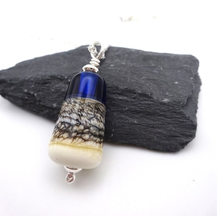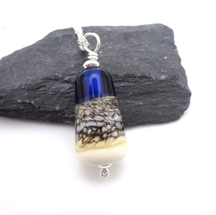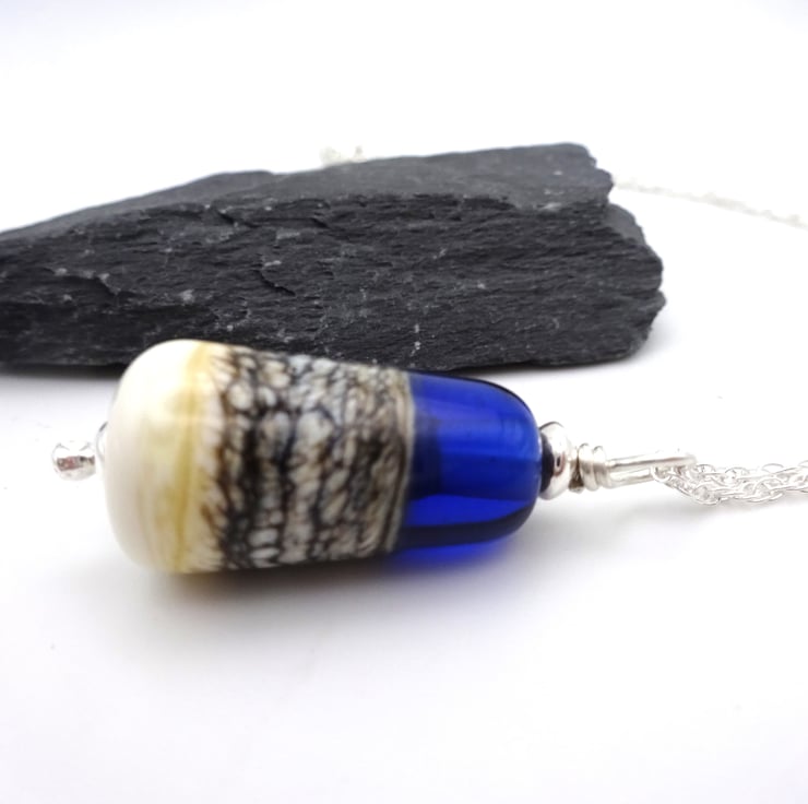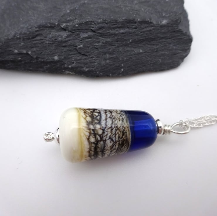 It features a sterling silver chain strung with a handmade lampwork glass pendant made with blue and ivory glass.