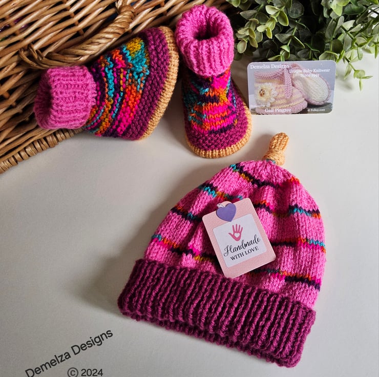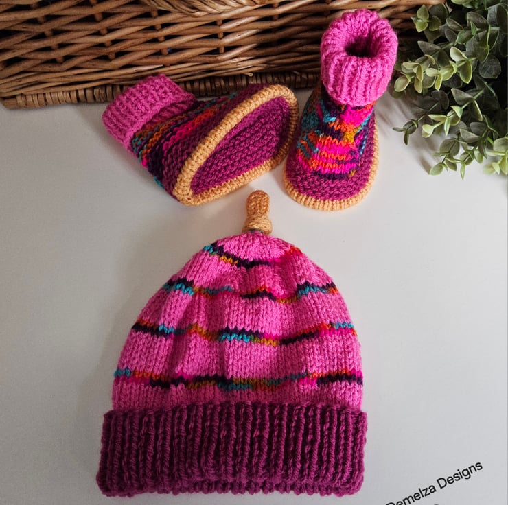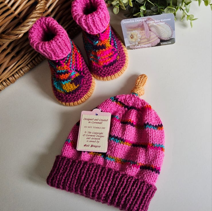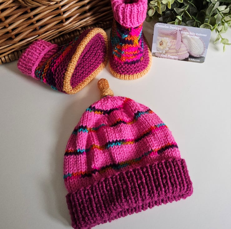 A bright unique baby girl's set ideal for a newborn or baby shower gift any mother would love to receive. Especially knowing no other mother will have a set identical for their baby. They have been designed and hand crafted in Cornwall using quality premium machine washable acylic yarns.