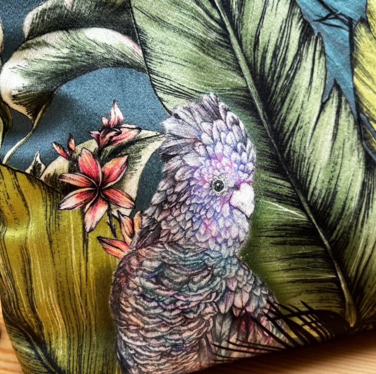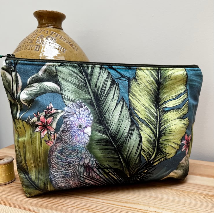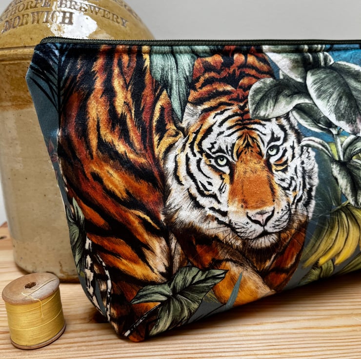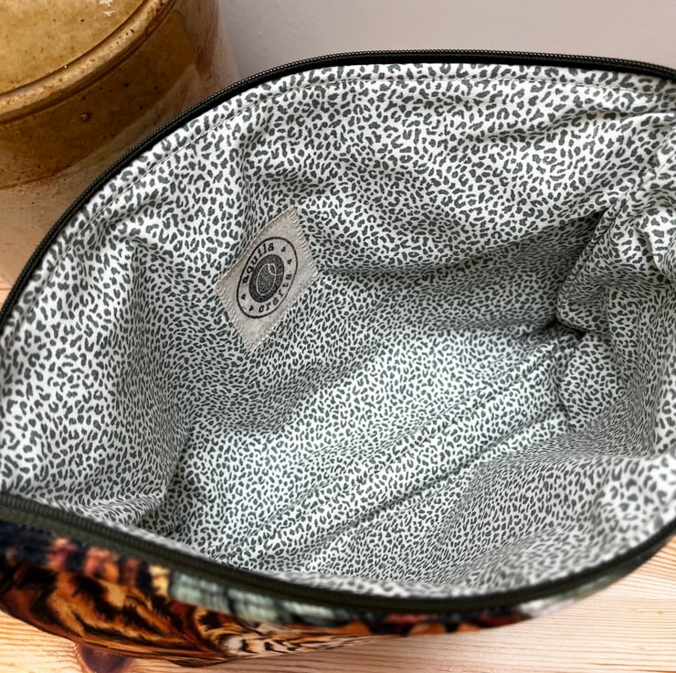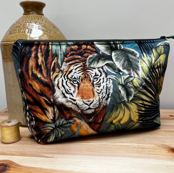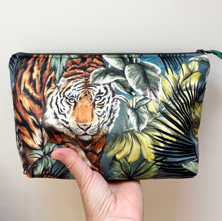 This wonderfully soft polyester velvet has a striking tiger emerging from tropical leaves in shades of green and blue. On the other side is an exotic bird. The bag is lined with tiny leopard print cotton and there is a layer of interlining to give the bag a soft squishy feel.