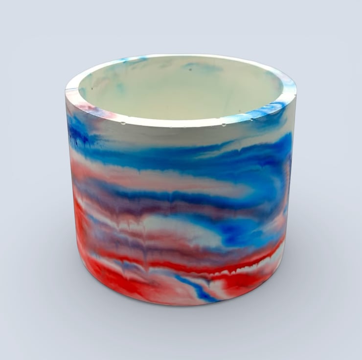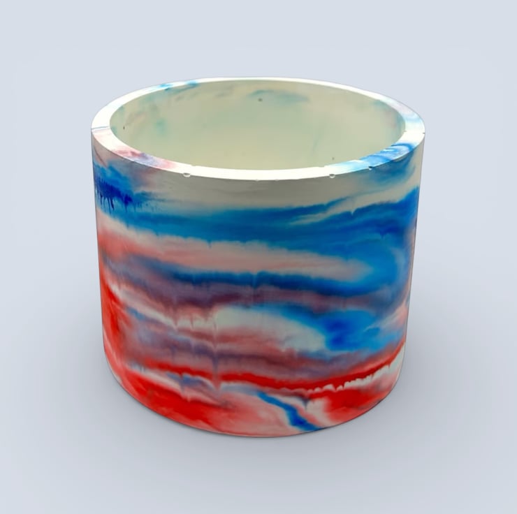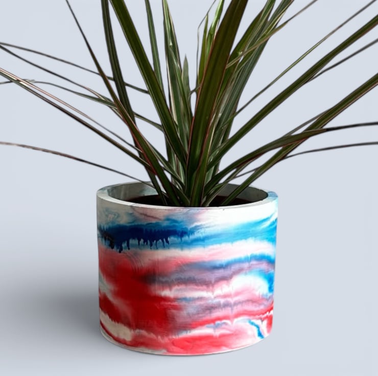 Large red white and blue marbled plant pot for indoor houseplants, succulents and herbs. This bold statement planter features layered bands of crimson, soft white and vivid blue that create a dramatic cloudy sky effect around the surface. A striking piece for shelves, desks or windowsills and a lovely gift for plant lovers who enjoy colourful handmade home decor.