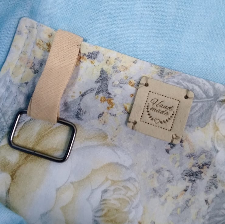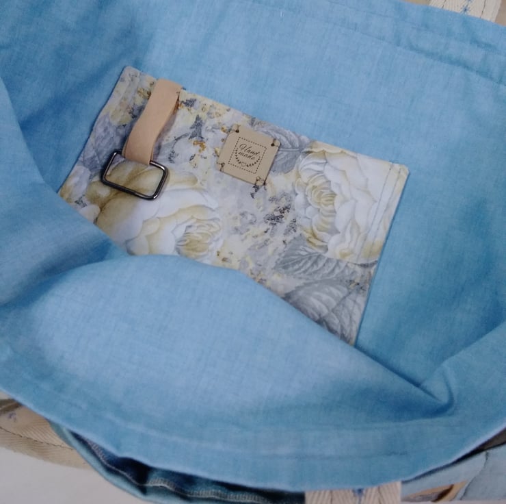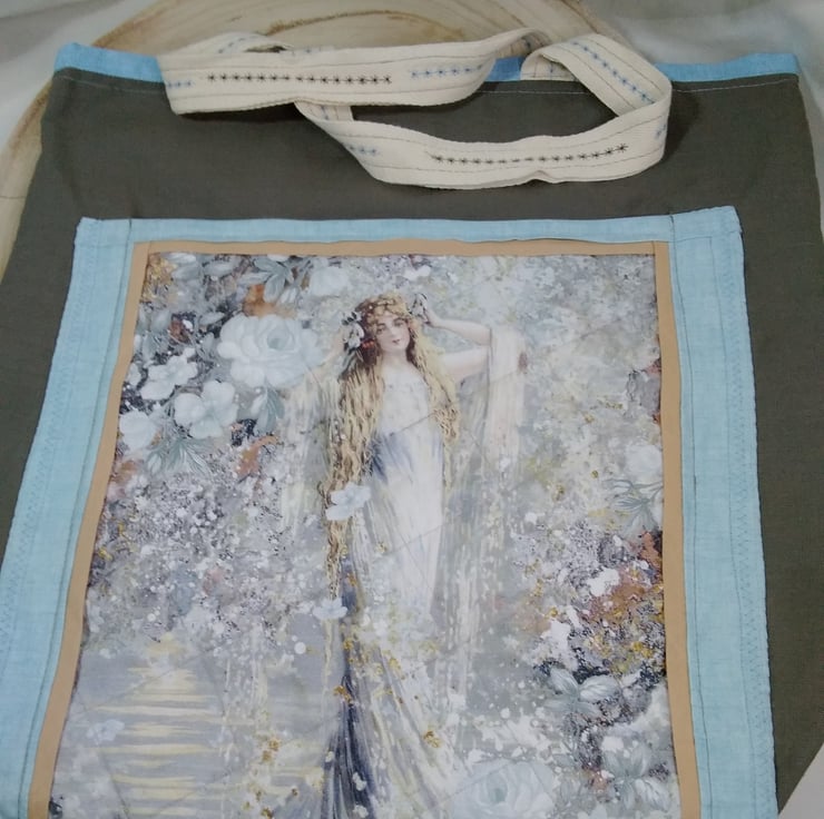 100% cotton lining in pale blue and outer with a large pocket showing an illustration of a mysterious young woman dressed in white robes surrounded in white roses.