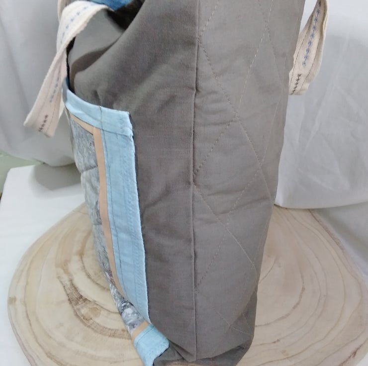 The bag has a nutmeg brown outer fabric which is quilted and the sturdy handles have an embroidered motif running their length. The bottom is boxed for more space and inside there is a rose fabric patch pocket with a useful key fob attached to complete the bag.