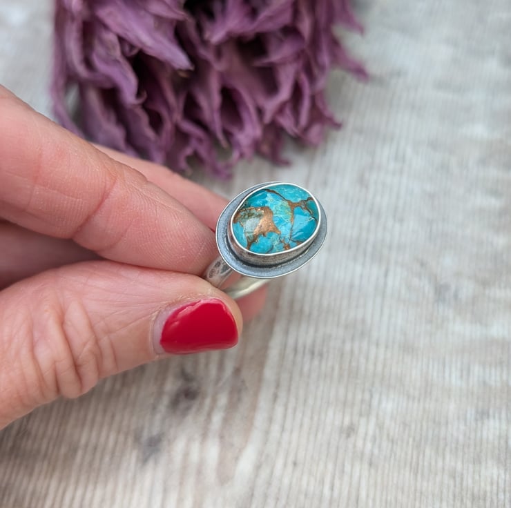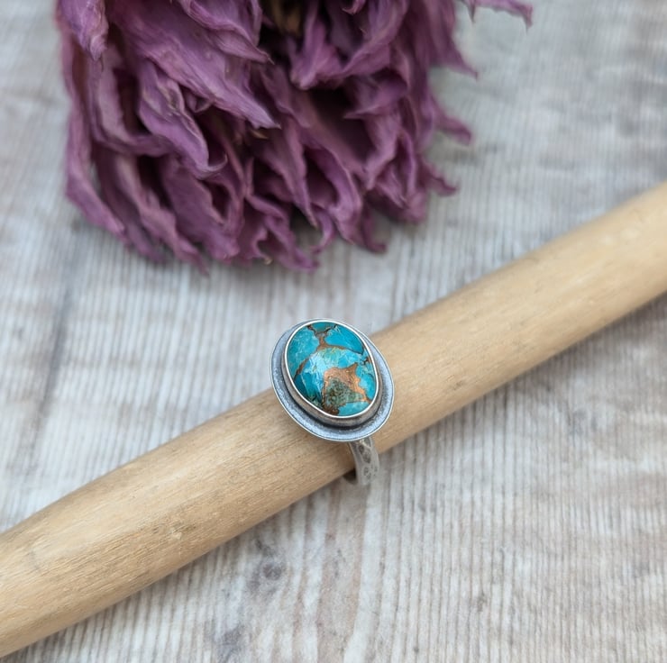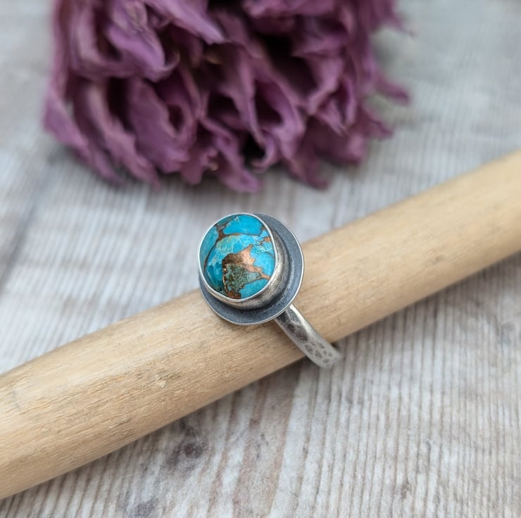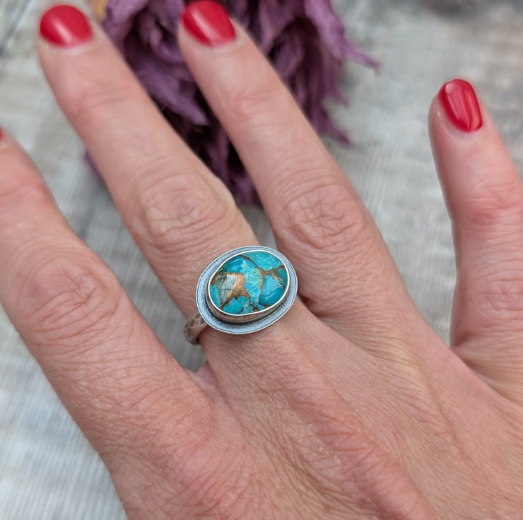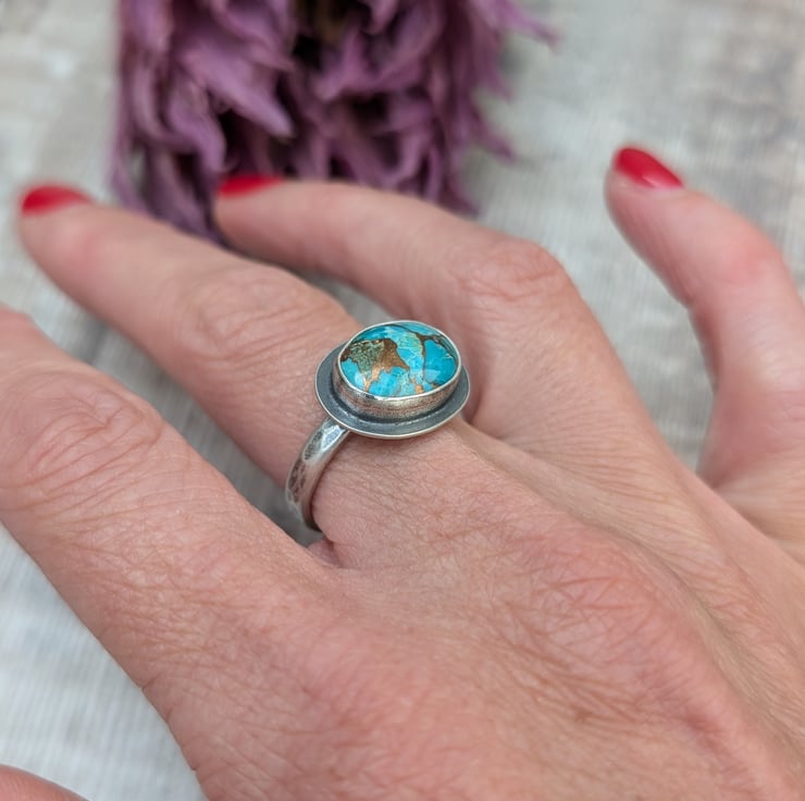 This striking ring features a vibrant Mohave Turquoise stone set in a handmade silver bezel with an oxidised finish. The unique turquoise pattern, combined with the textured silver band, creates a bold and distinctive look. Crafted from recycled silver in Bristol, UK, this ring is perfect for adding a pop of colour and character to any outfit.