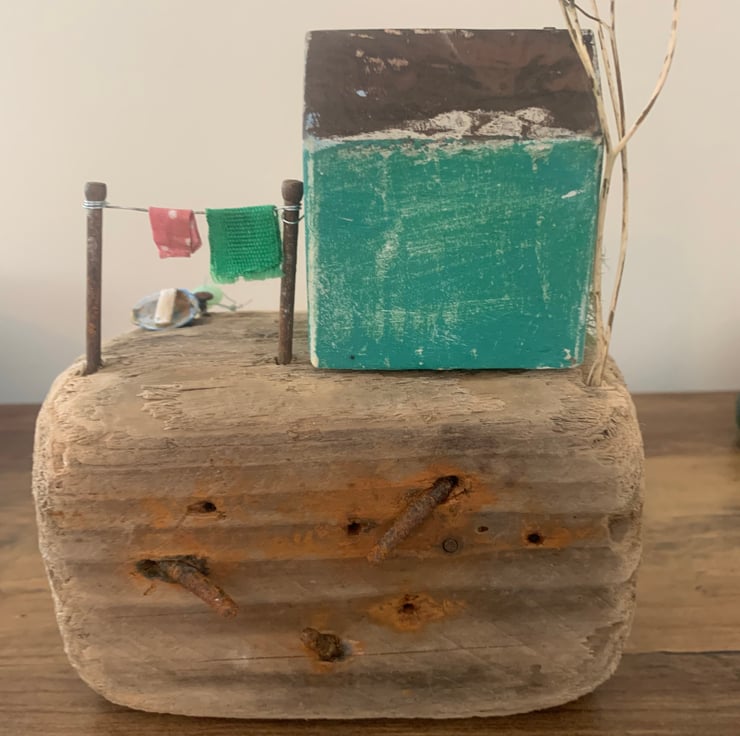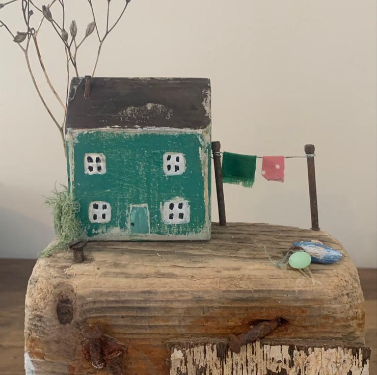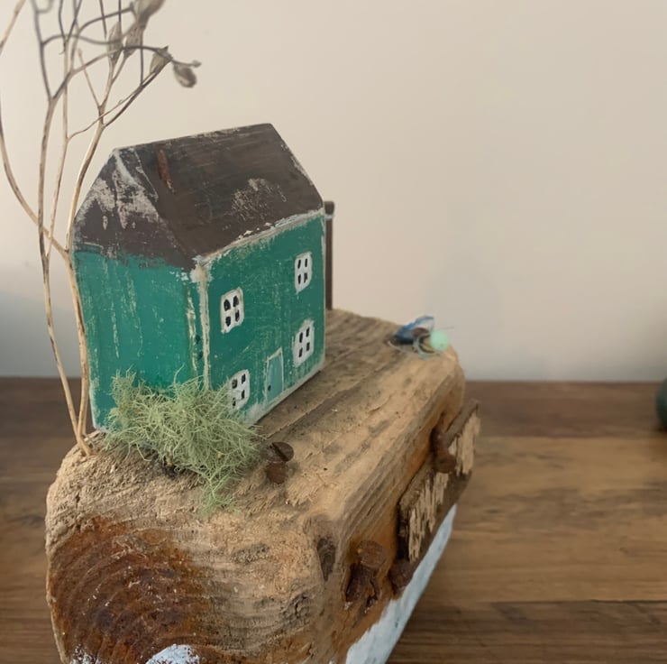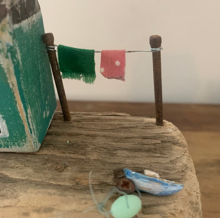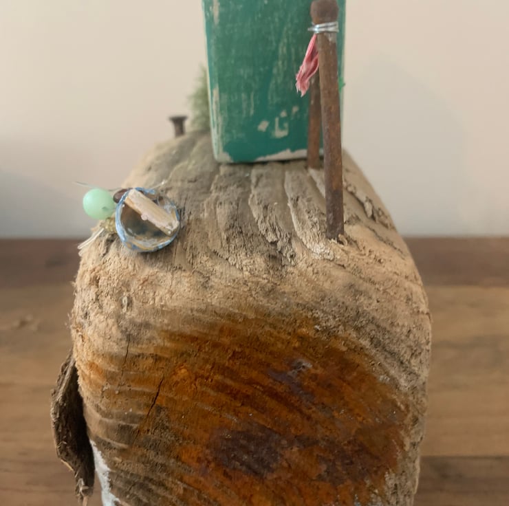 I have put together this rustic coastal scene using driftwood collected on the beaches around St. Austell Bay . The main block of driftwood has been washed and kept in its original consition . There are rusty nail prodruding from the wood giving it a rustic look .