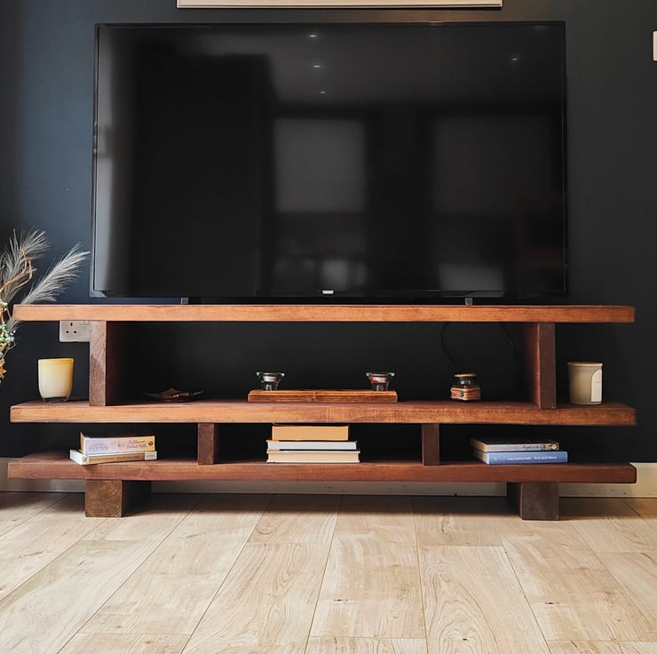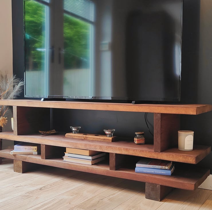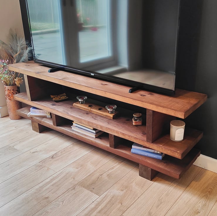 Transform your living space with this beautifully crafted rustic handmade wooden TV stand, a perfect blend of natural elegance and functionality. Made from high-quality, solid wood, this entertainment center is designed to bring a touch of farmhouse charm to your home. Each piece is meticulously handcrafted, highlighting the unique grain and texture of the wood, ensuring no two units are alike.