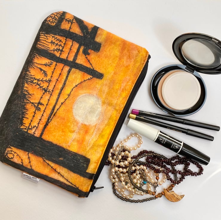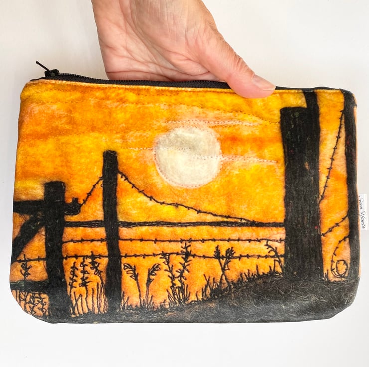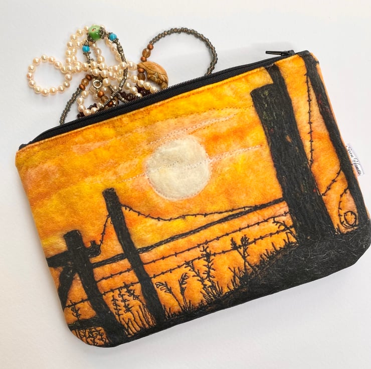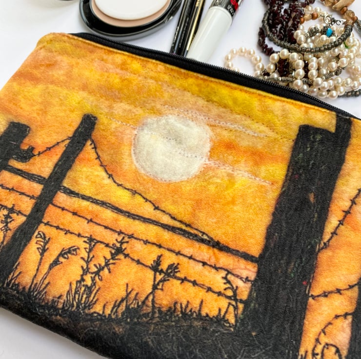 This highly versatile luxurious zip bag is decorated with a print of one of my embroidered landscapes of Yorkshire. This one shows a sunset setting behind a fence. It’s lined inside with a water proof lining, and has a matching coloured zip. The print is on the front and back.