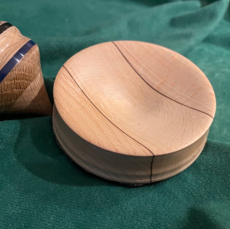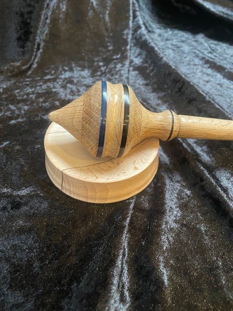 A nice supported spindle in a mix of hardwoods with black and blue resin highlights. Its 32cm x 5cm diameter and weighs 66 grms. A removable hook is included. The support bowl has mahogany bands and is dished to assist with location. Finished with a felt base.