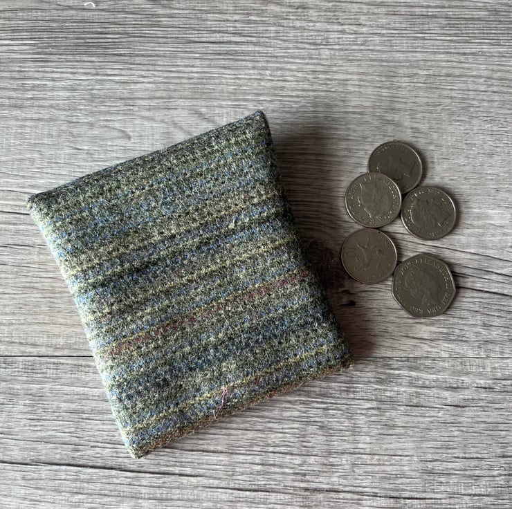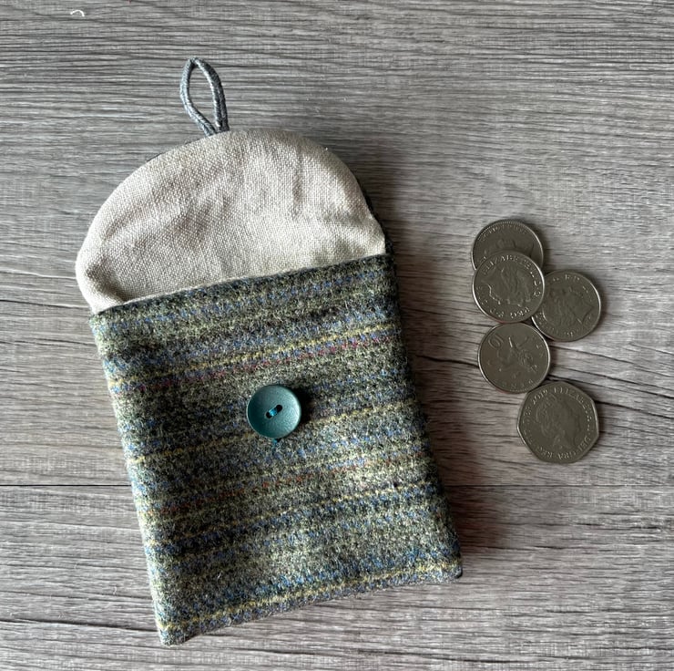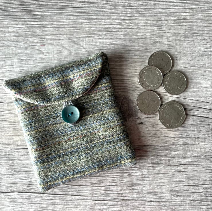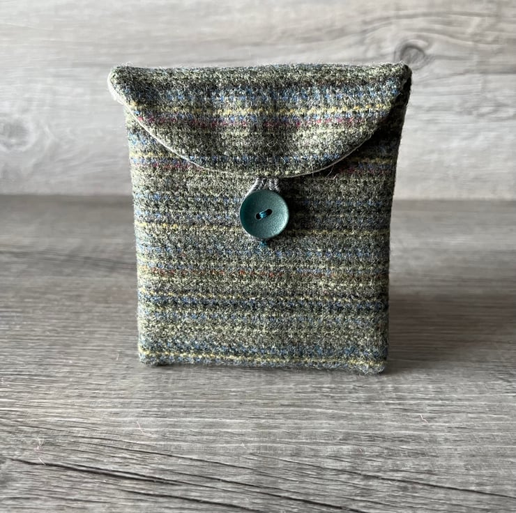 This little button purse is made from a gorgeous thick woven wool fabric in moorland shades of grey - green with subtle touches of yellow, blue and brown.