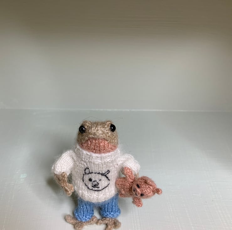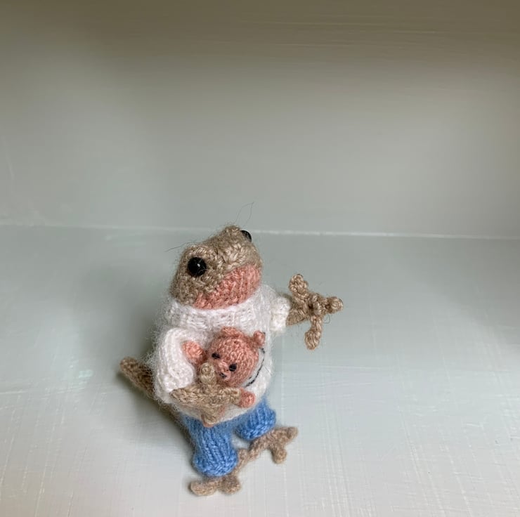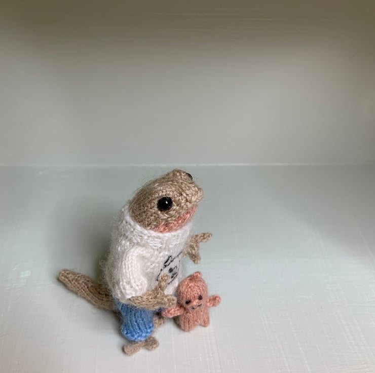 Made from Alpaca yarns, this tiny newt stands a smidge under 2 1/2” tall and her body and limbs are wire with jewellery wire, not her toes though! She does stand well, as her tail helps support her!