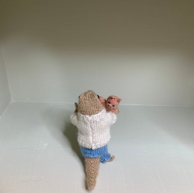 I made her from the wonderful Dot Pebbles Newt Pattern and designed her little outfit with piggy motif to go with her little piglet toy which she takes everywhere!