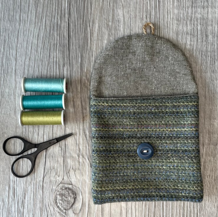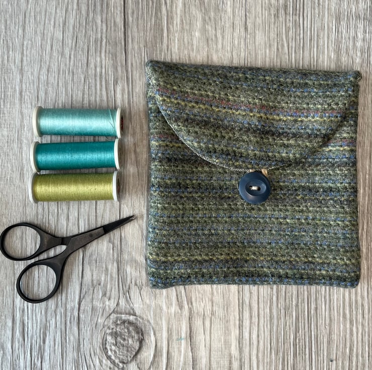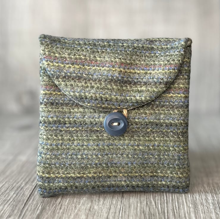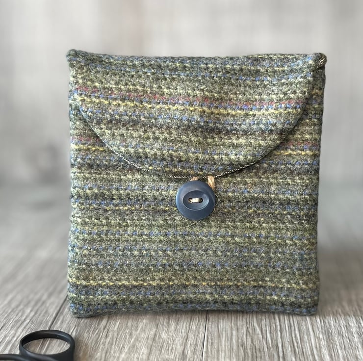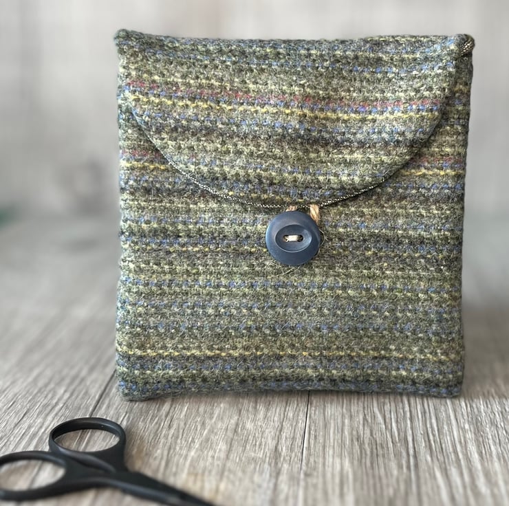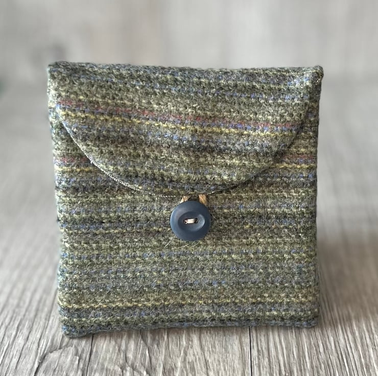 This little button purse is made from a gorgeous thick woven wool fabric in moorland shades of grey - green with subtle touches of yellow, blue and brown.