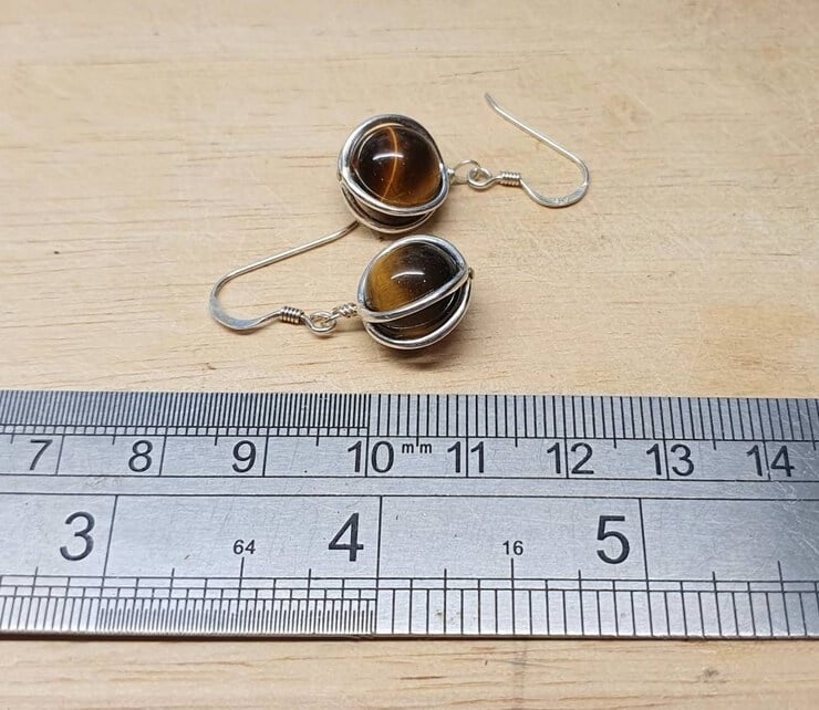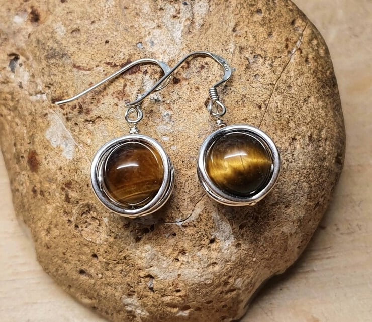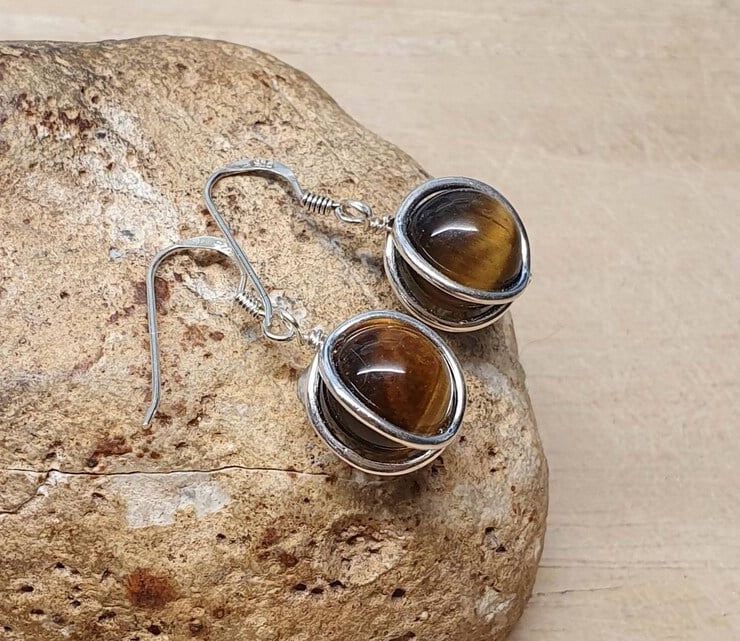 This is a women's small minimalist sterling silver golden brown tigers eye circle earrings with silver 3D circle frames. Perfect for a Capricorn birthstone gift. Stones will vary from the photos.