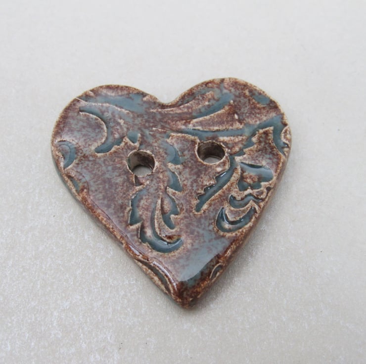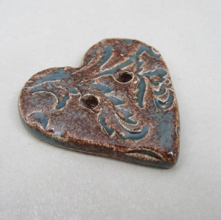 Medium heart shaped stoneware button, textured with a bold leaf and flower motif.