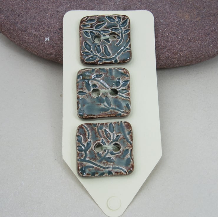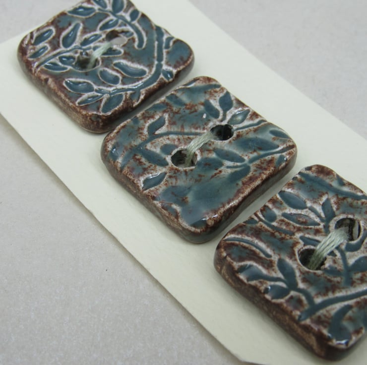 3 medium sized earthenware buttons, textured with delicate leaf print and finished with a glossy sedge green - brown glaze.
