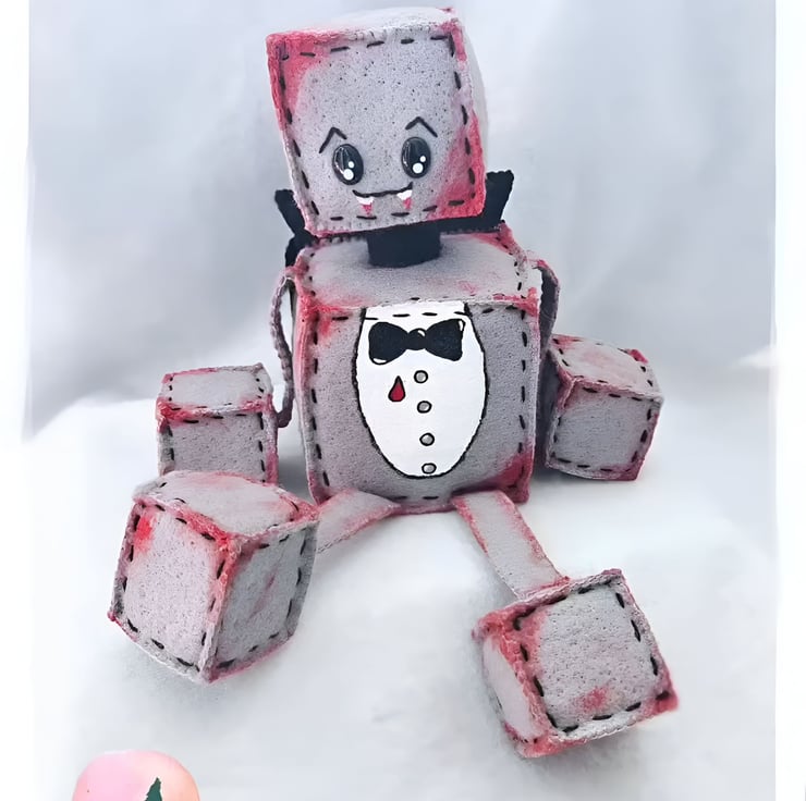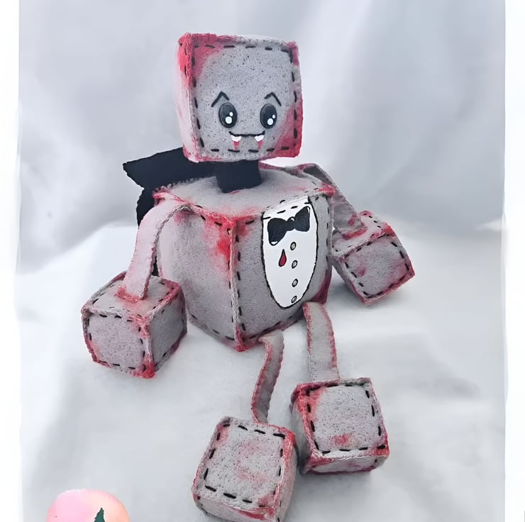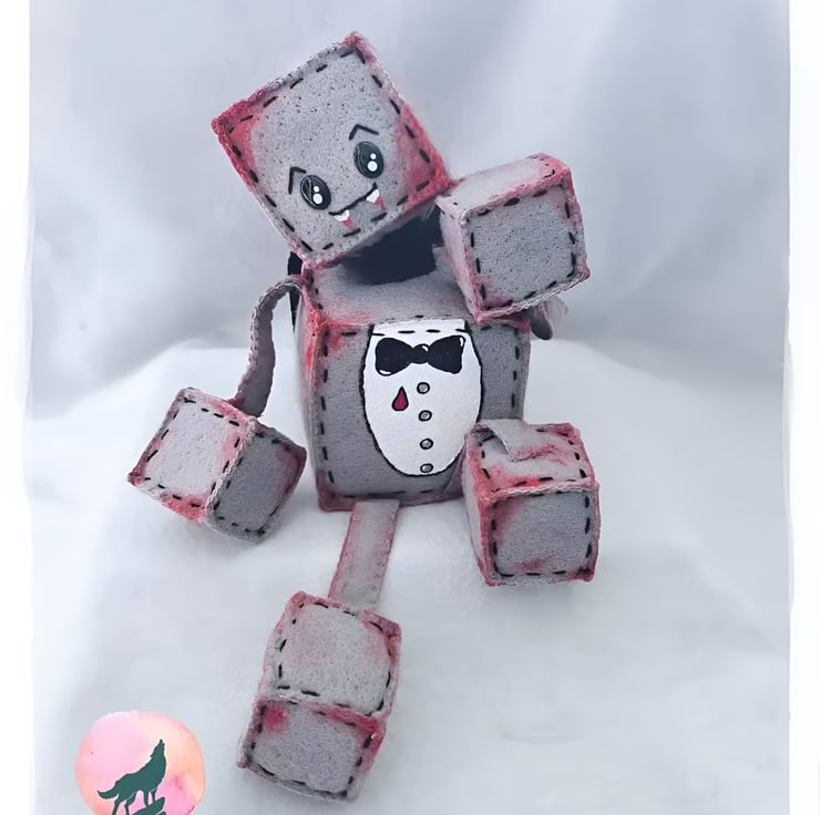 What is halloween without a Robot Vampire Plushie. He is made from cubed wool blended grey felt that makes up his body. He has a painted white shirt & black cape with touches of red paint to the body as a touch of drama to his look.