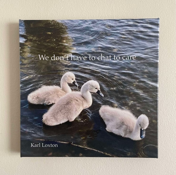 Swans Canvas print by Karl Loxton, 10 by 10 inches by 2cm deep. "We don't have to chat to care", ready to hang on the wall. I'm selling my friend's wonderful work for him xxx
