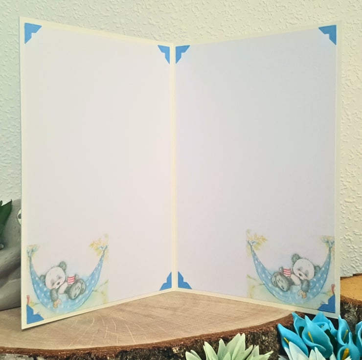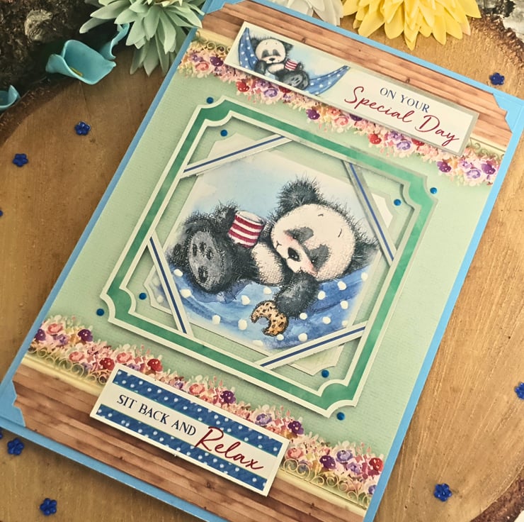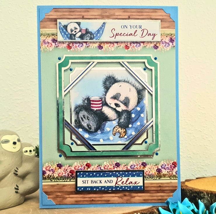 Handmade card featuring a panda relaxing in a blue, spotty hammock, while enjoying a nice cuppa and a cookie! Perfect for Grandad's or Dad's birthday, Father's Day, or Retirement.