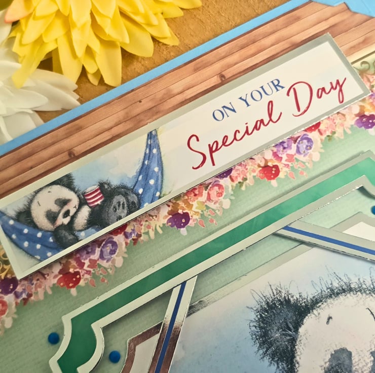 The card consists of mats & layers of pastel blue card & pastel mint green cardstock printed with floral / wood borders on top & bottom. The main square topper is placed in the middle, surrounded by matching, silver foiled frames. The sentiment "On Your Special Day" is displayed above the main topper, while the sentiment "Sit Back And Relax" is underneath it. The card is embellished with blue diamante & white colour drops on the hammock's spots. It is finished with coordinating inserts, blank, for you to add your own messages and wishes. Decorative photo corners give a unique touch to the card.