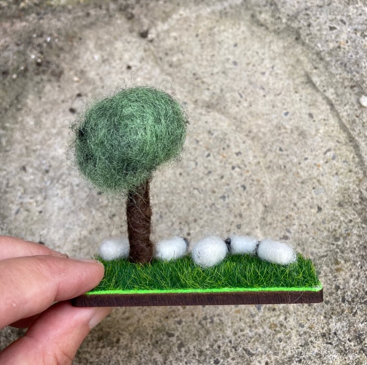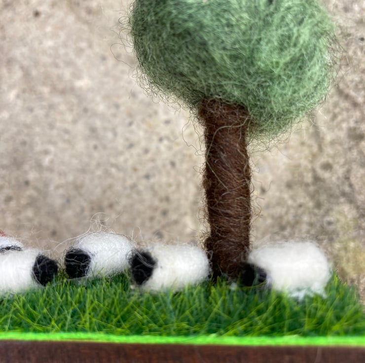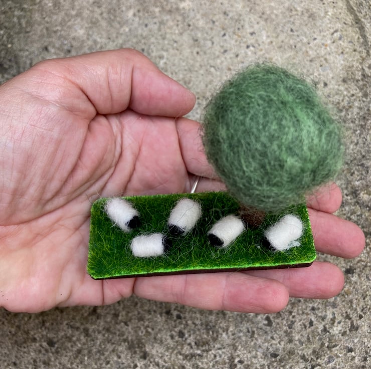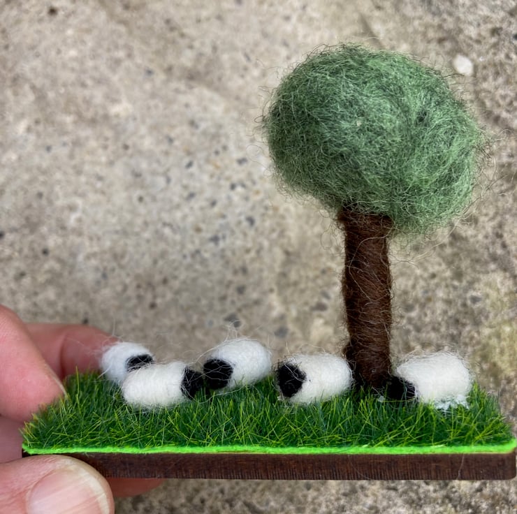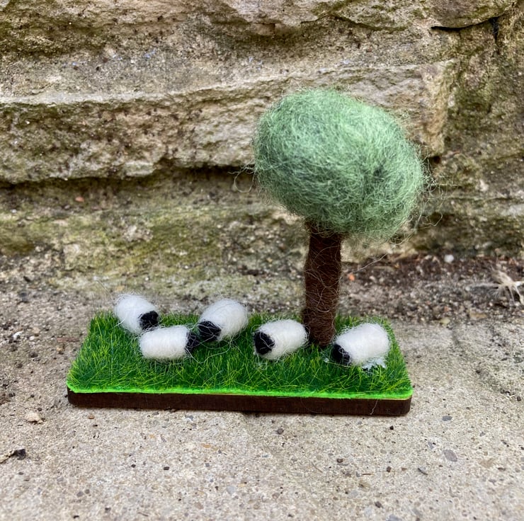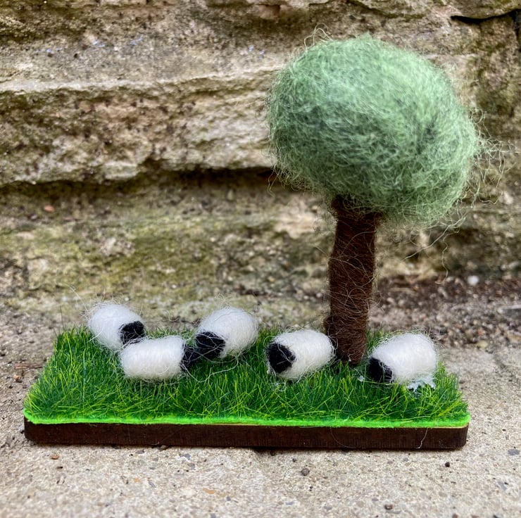 A sweet miniature, a 3d needle felted ornament of black faced sheep grazing beneath a tree. A tree and five miniature sheep have been needle felted using woollen fibres and a barbed felting needle. These have then been mounted on a small (8cm x 3cm) wooden plaque covered in artificial grass material. The ornament stands approximately 7cm tall with each sheep measuring approximately 1cm long.