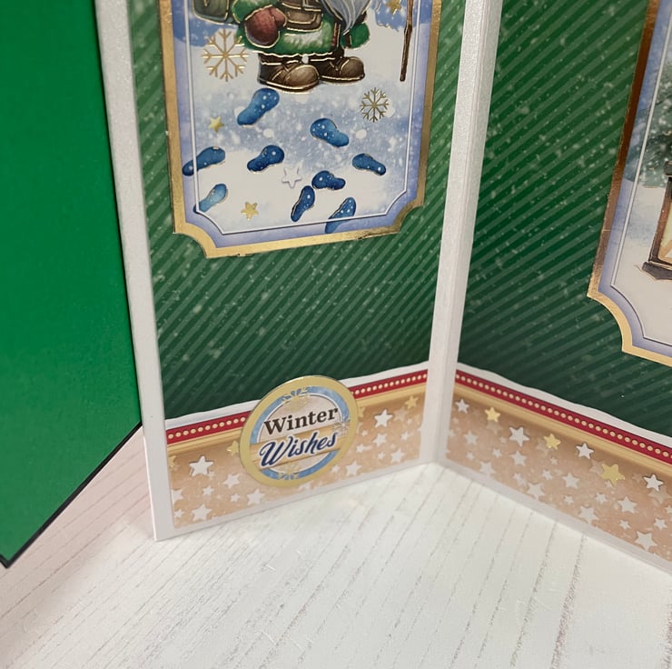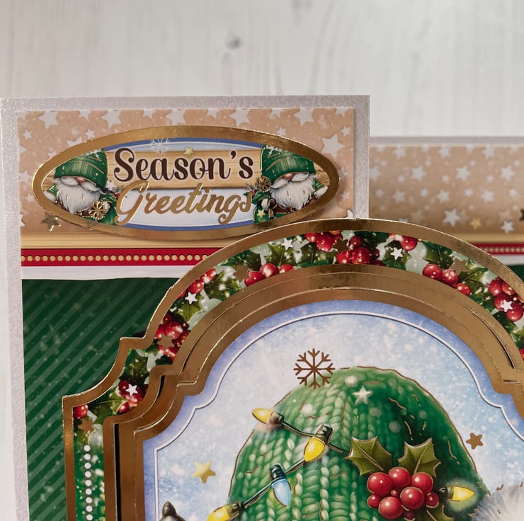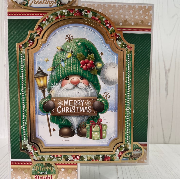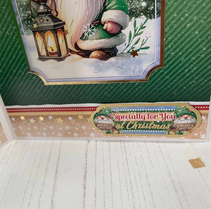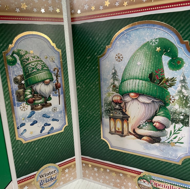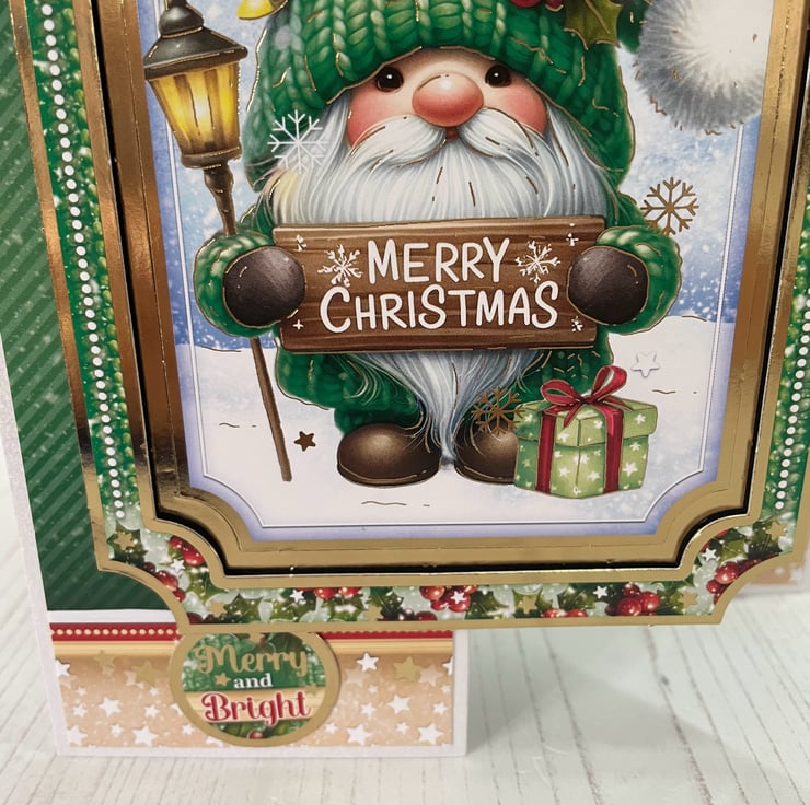 Z folded A5 card with a Christmas backing card. Gnome framed topper on the front. More gnomes on the inside and another on the back inside card. Messages. Plain back for your own message. Mounted onto ivory pear card with pearl envelope.