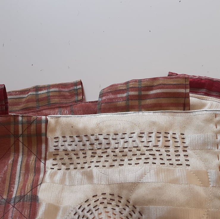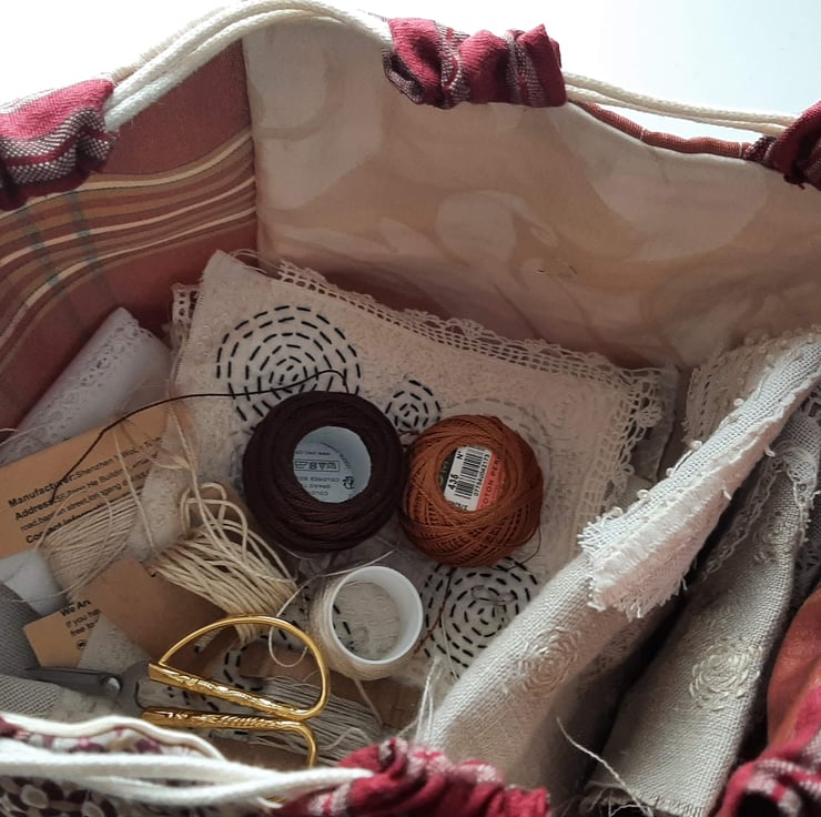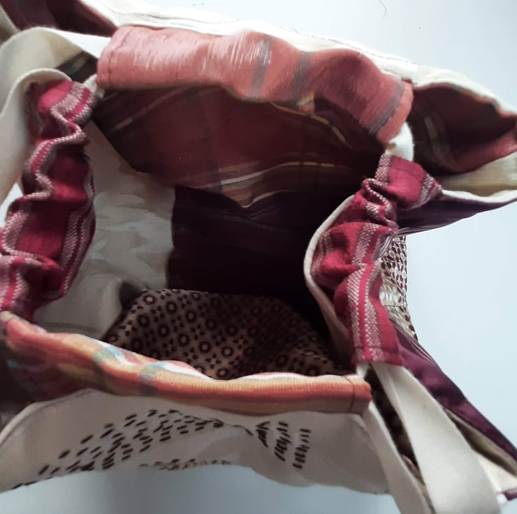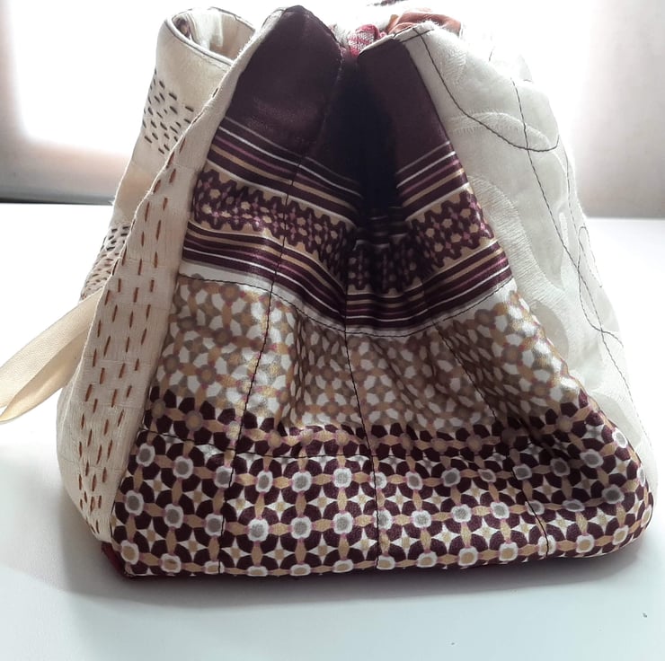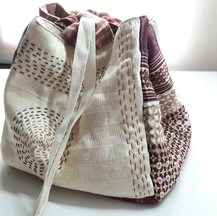 It always starts with the fabric and I was lucky to be gifted some cream damask and then I spotted a skirt in a second hand shop in burgandys and cream and then I remembered I had some silk in exactly the same colours.......... I had never made a komebukuro before and that was a challenge but I enjoyed the process.