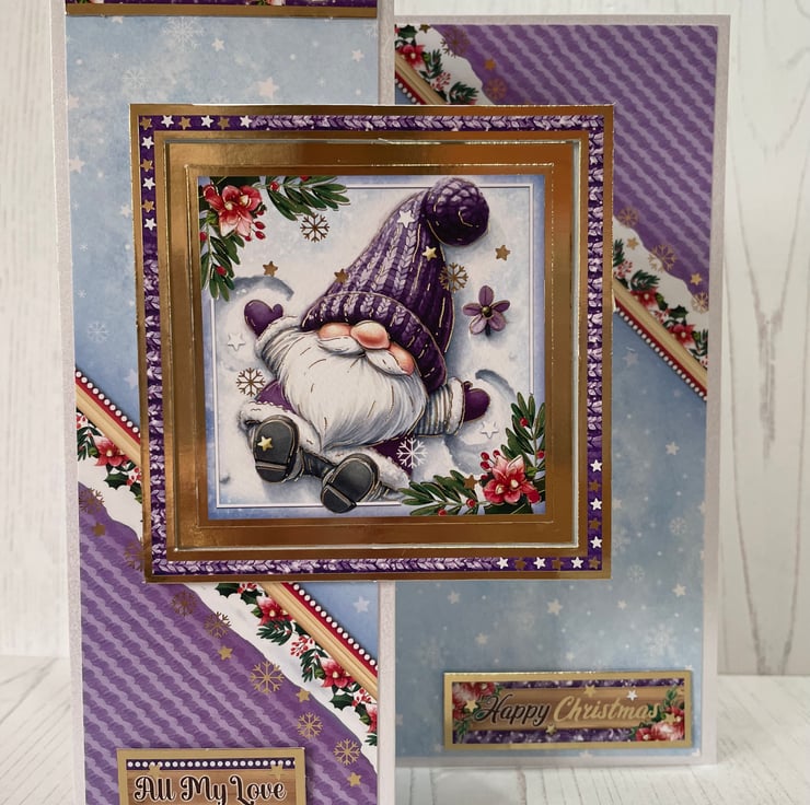 Z folded A5 card with a Christmas backing card. Gnome framed topper on the front. More gnomes on the inside and another on the back inside card. Messages. Plain back for your own message. Mounted onto ivory pear card with pearl envelope.