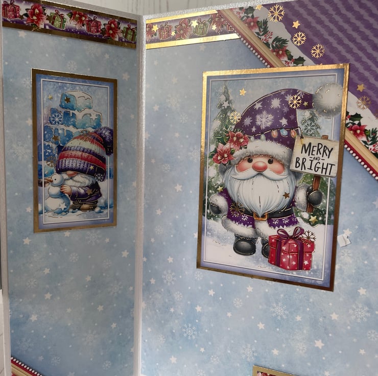 Z folded A5 card with a Christmas backing card. Gnome framed topper on the front. More gnomes on the inside and another on the back inside card. Messages. Plain back for your own message. Mounted onto ivory pear card with pearl envelope.