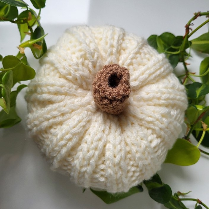 Hand knitted in cream chunky yarn with an adorable little knitted stalk.