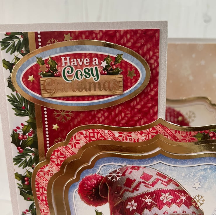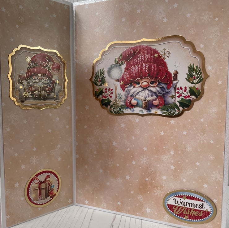 Z folded A5 card with a Christmas backing card. Gnome framed topper on the front. More gnomes on the inside and another on the back inside card. Messages. Plain back for your own message. Mounted onto ivory pear card with pearl envelope.