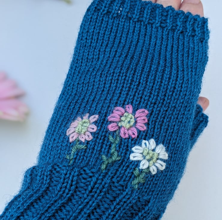 Fingerless gloves knitted in wool with pink and cream embroidered daisy flowers