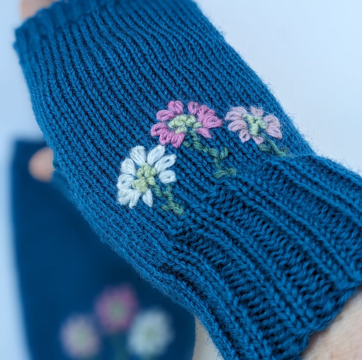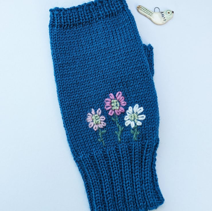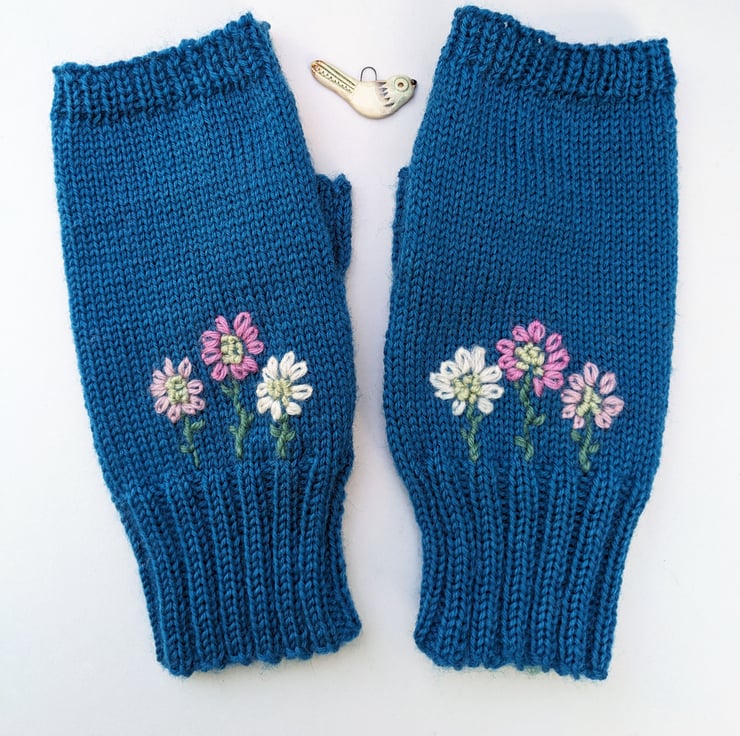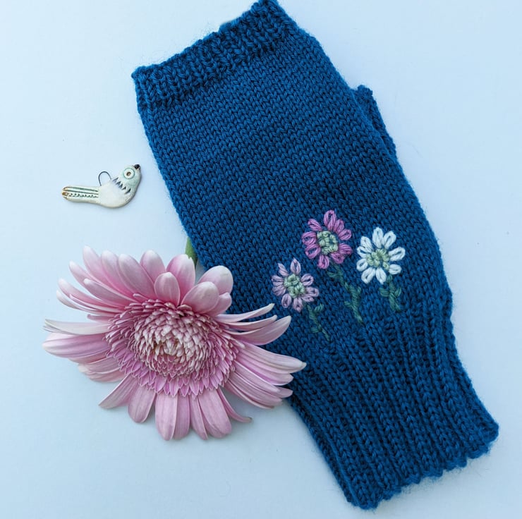 Knitted fingerless gloves in merino wool with small hand embroidered flowers on the front. These wrist warmers are knitted on my vintage knitting machine and the embroidery is created by hand with 4ply wool. They will keep your hands warm on cold walks or while working in a chilly studio, home or office. The flowers on the front are small white and pink daisies, with green centres and stems.