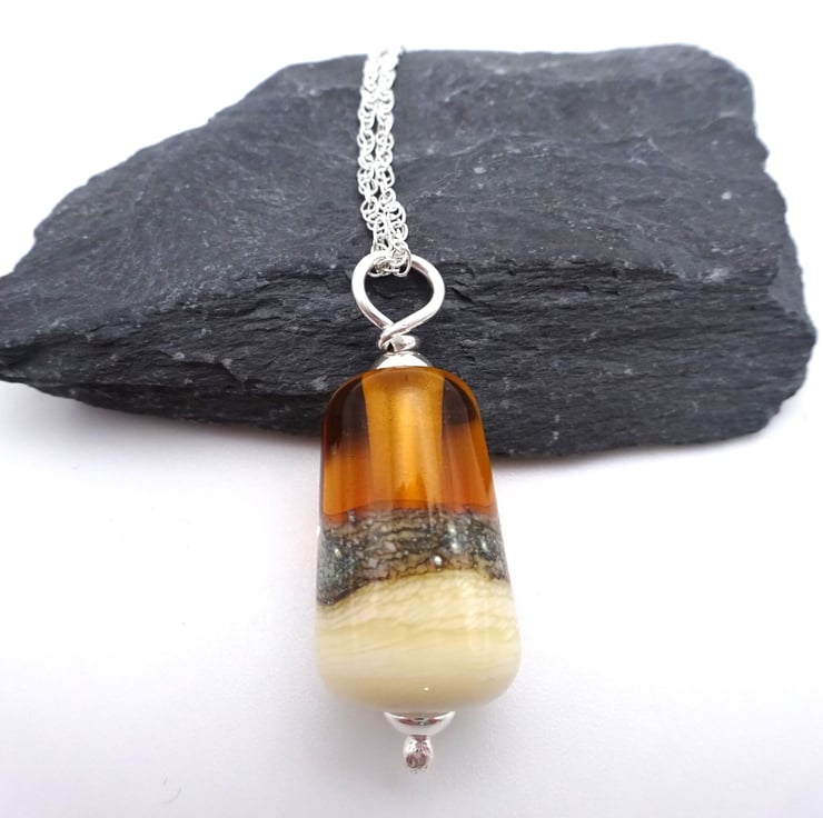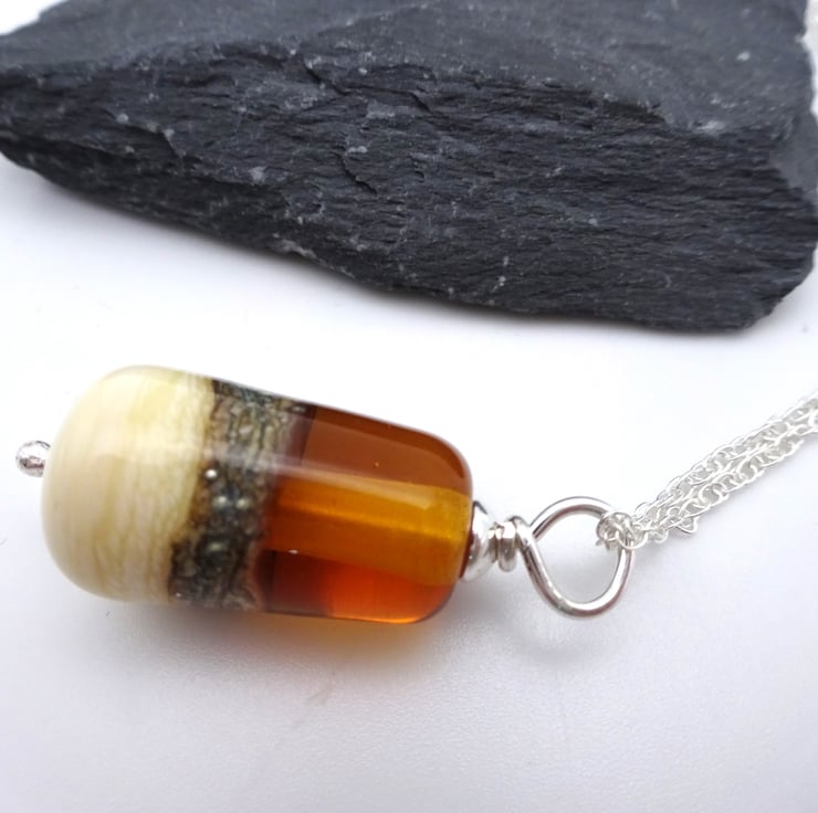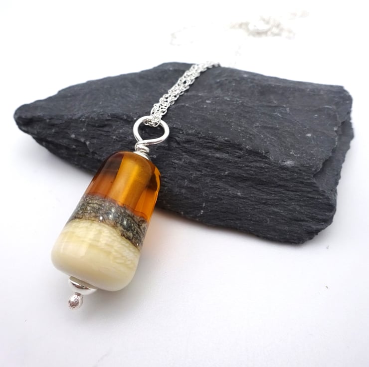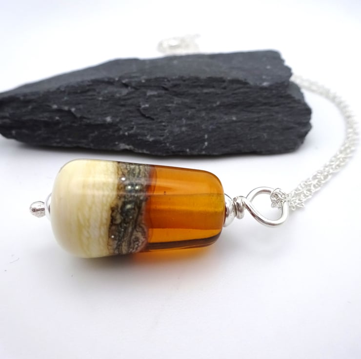 It features a sterling silver chain strung with a handmade lampwork glass pendant made with amber and ivory glass.