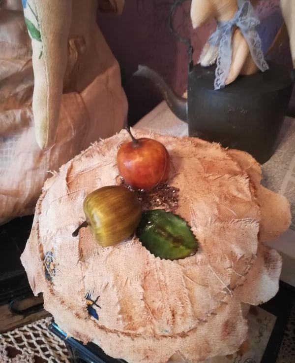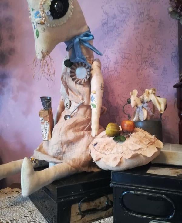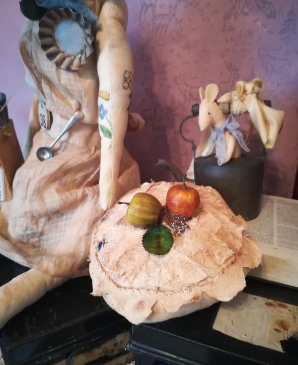She has a worn card box which is adorned with vintage preserve and baking labels, vintage cake tins, a vintage kettle, mini mouse friend in vintage linen and a hand made vintage linen apple pie which I hand dyed to match and topped with mini vintage apples!