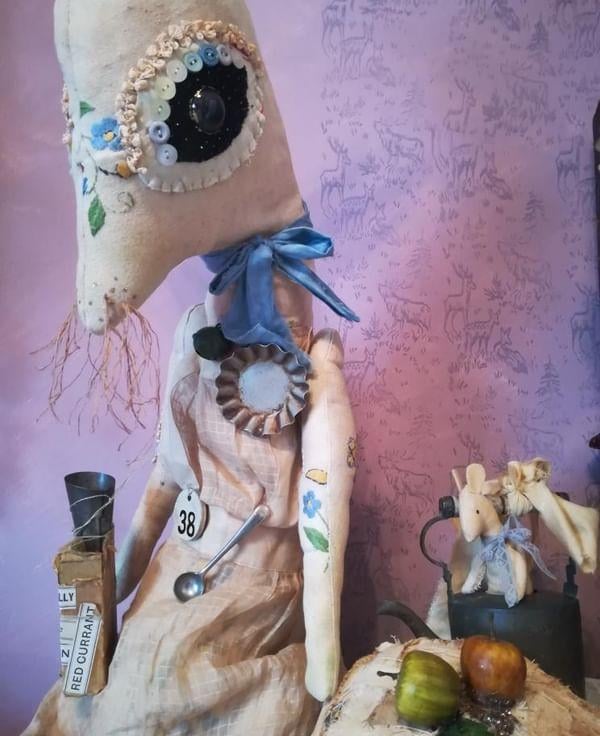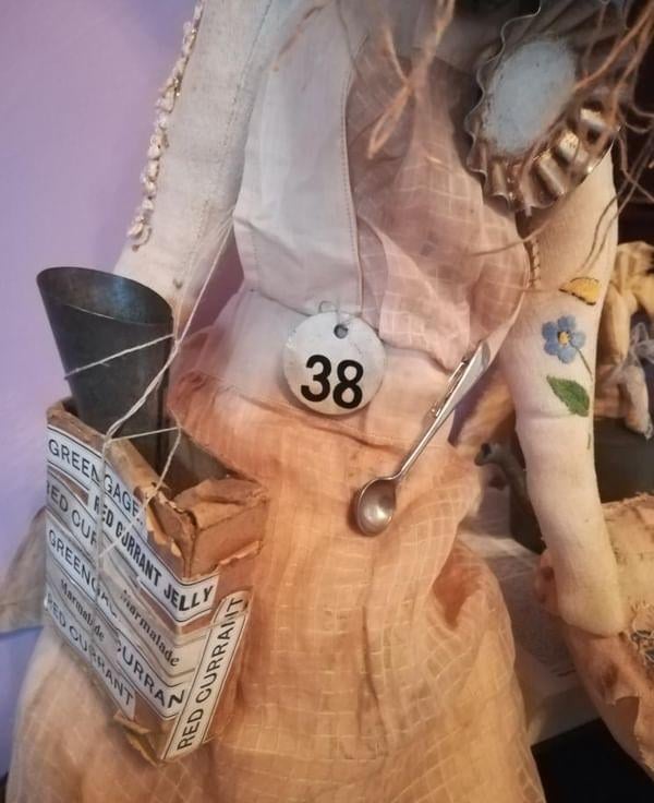 She has a vintage apron, spoon brooch and lots of small details such as buttons, a fabric bow and found trinkets.