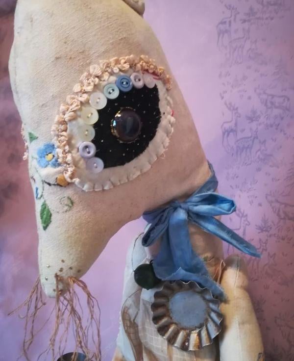 Her body is made from vintage embroidered linen, carefully stitched together to create a well-loved, timeless appearance.
