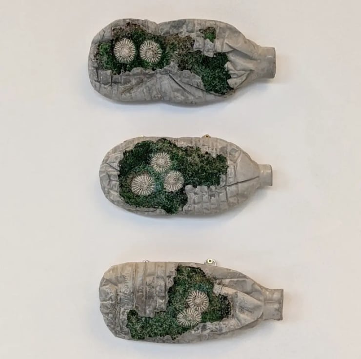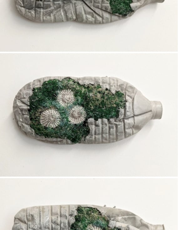 My work investigates change over time, not just eroding or decaying but new layers of growth, giving juxtapositions of structure and colour. Recent work highlights the issue of plastic pollution and the permanence of disposables through sculptures that combine embellished textiles and cement cast in plastic waste, inviting us to consider the packaging that we use and discard on a daily basis; objects that are so lightweight and seem so insignificant that we barely notice them. Naturally inspired textures emphasise the way our waste becomes subsumed into the natural world around us.
