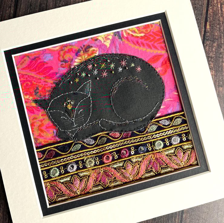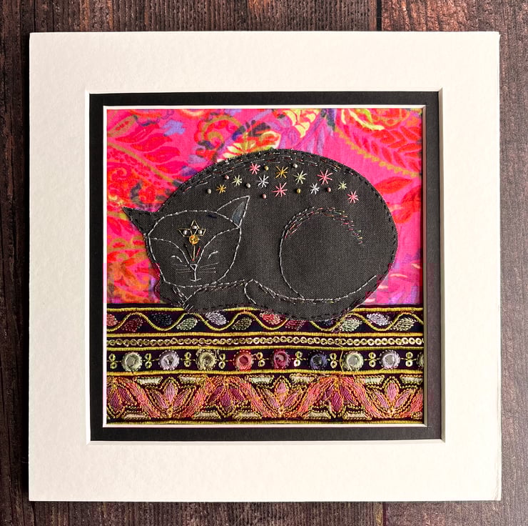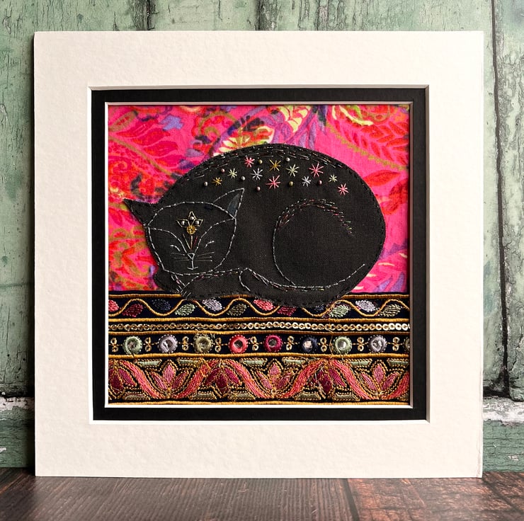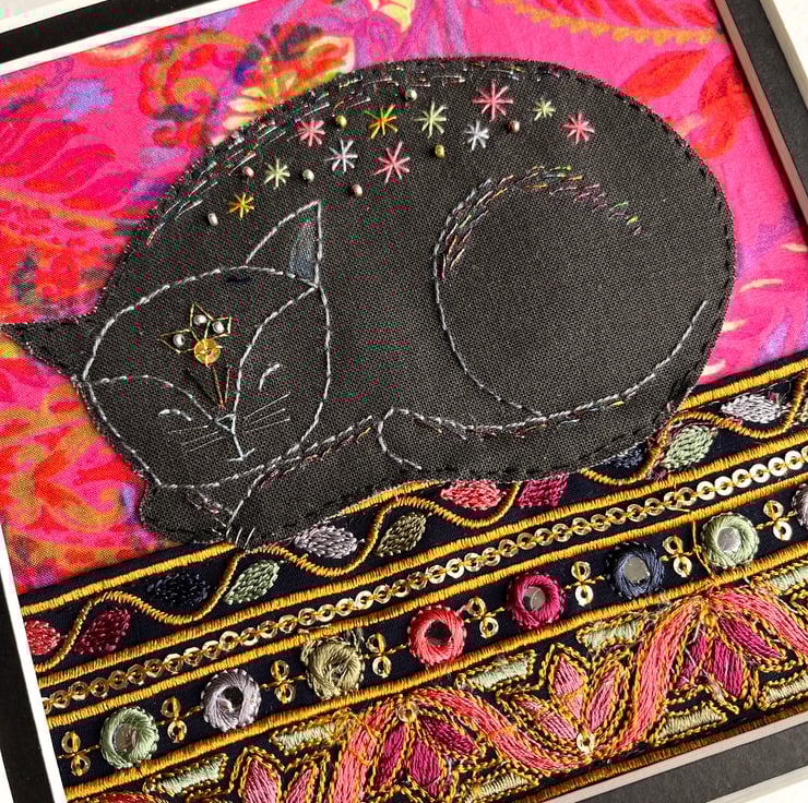 I've used a colourful piece of fabric for the background and the cat is snoozing contentedly on a strip of embroidered Indian trim which is decorated with sequins and metallic threads.