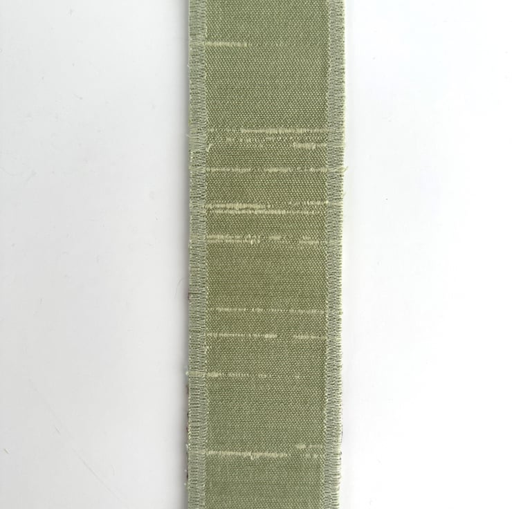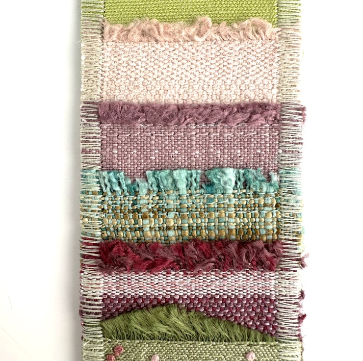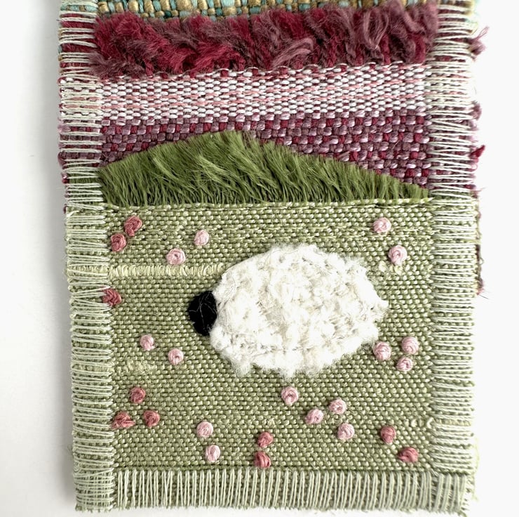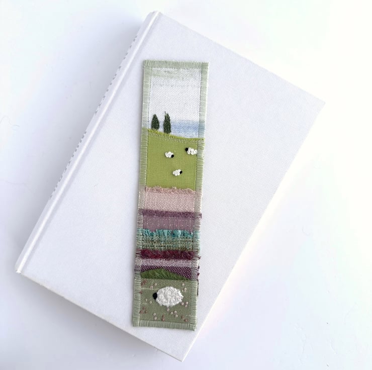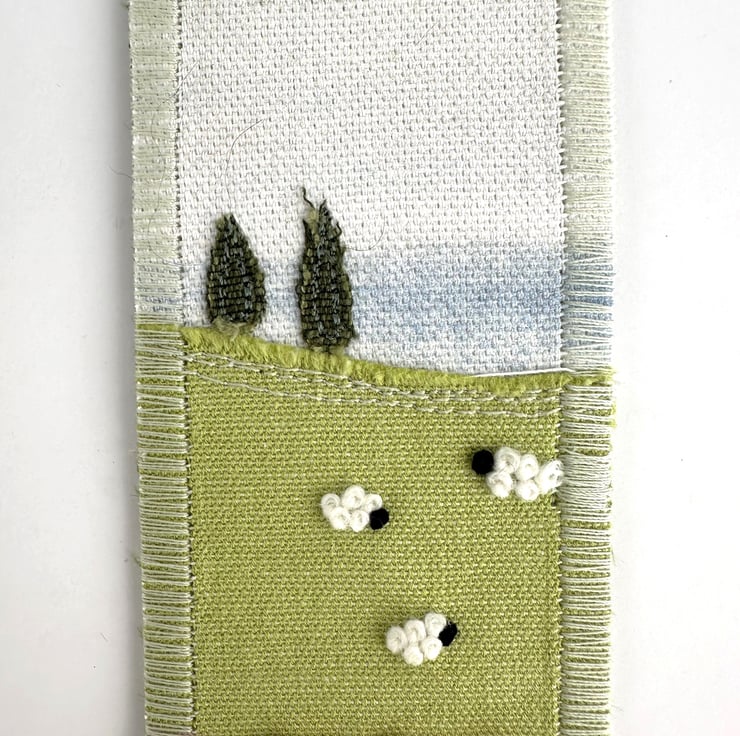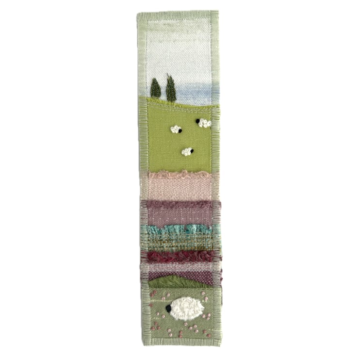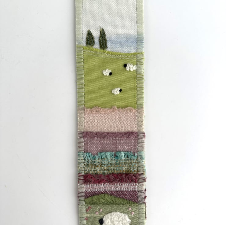 Bookmark with meadows and sheep. This pretty countryside themed bookmark is made from a number of layers of different fabrics. The bookmark depicts pastures and fields, under a partly cloudy sky. I've used a pale blue and white abstract print fabric for the sky. The meadows are made from a mixture of fabrics in various shades of green and pink. The frayed raw edges of some of the fabric, and the inclusion of some selvedge edges, give the impression of vegetation at the ends of the fields. On the hill in the background I've added a flock of tiny sheep, which I've hand embroidered with angora yarn. There are two dark green appliqué trees on the horizon. To the pasture in the foreground, I've added an appliqué, free-motion and hand embroidered sheep, along with some tiny French knot flowers in two shades of pink. The bookmark is backed with pale green fabric with paler green flecks, edged with pale green zig-zag stitching, and stiffened with an inner layer of interfacing.