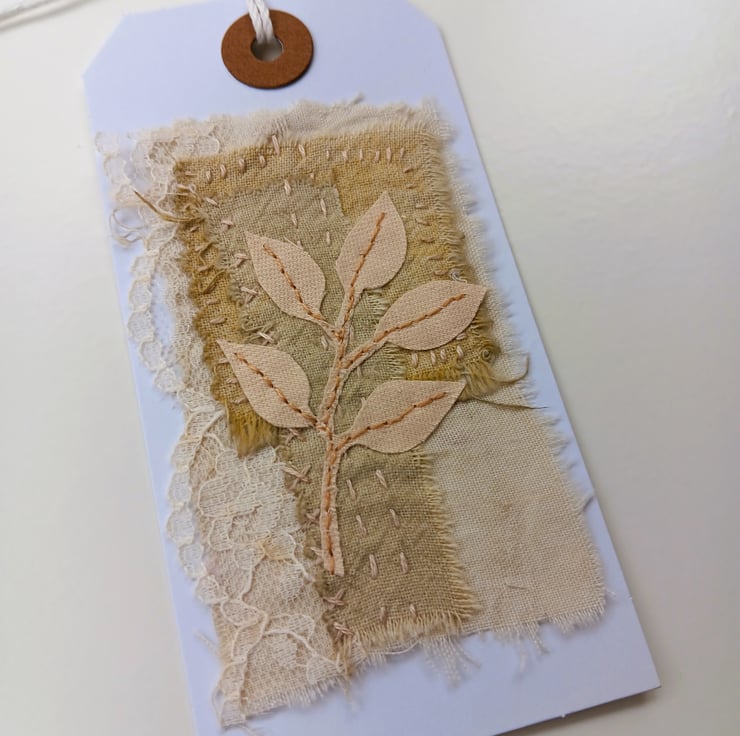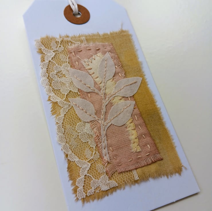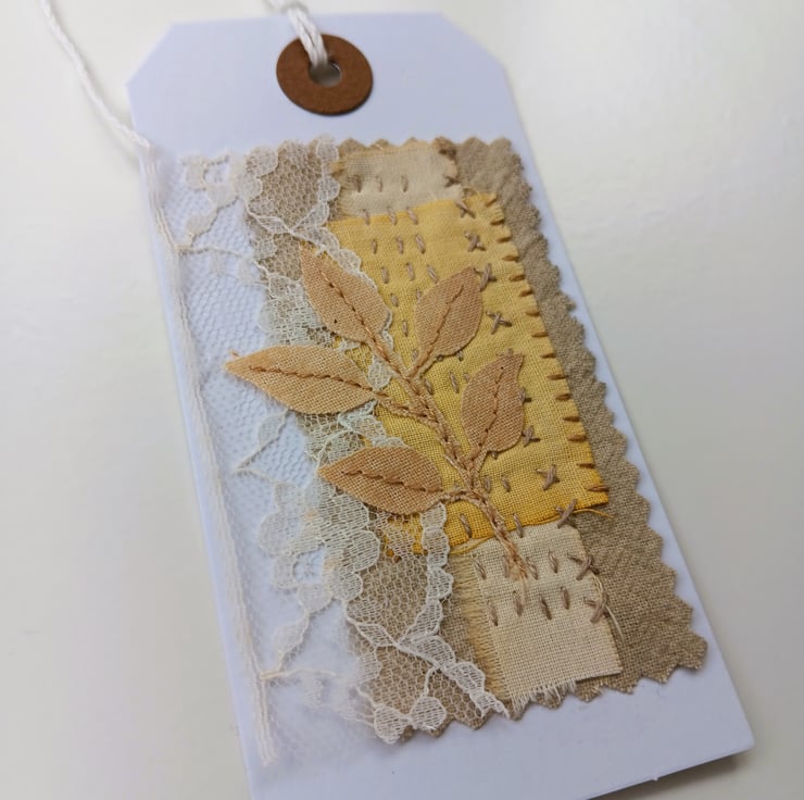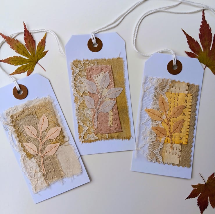 Set of 3 gift tags featuring my own unique hand cut leaf motifs on collages of hand painted fabrics; embellished with lace and hand embroidery.
