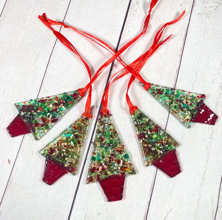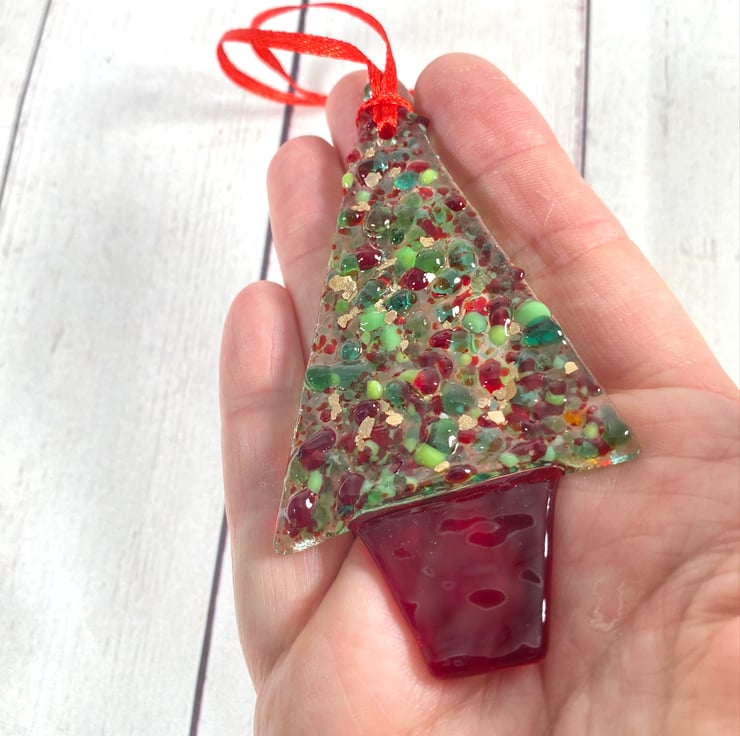 Pretty traditional reds and greens with gold flakes . These fused glass Christmas trees are approximately 3.5 inches tall and catch the light beautifully on the Christmas tree or hanging at the window .