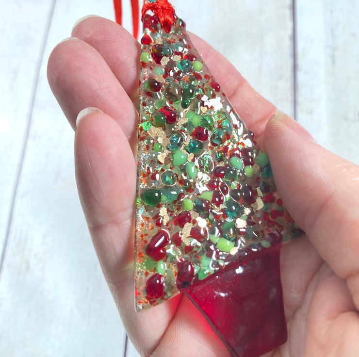The green and red glass is cut into small pieces and fused to around 750 degrees c . The trees are then drilled and strung with red satin ribbon .