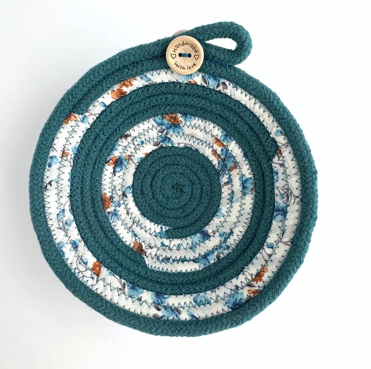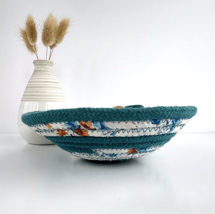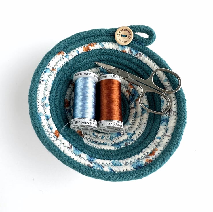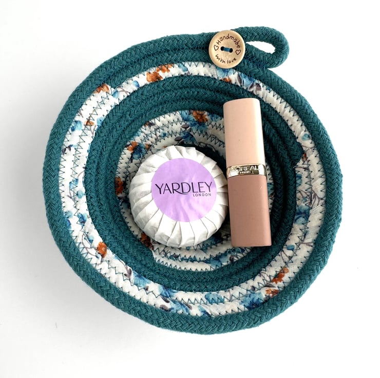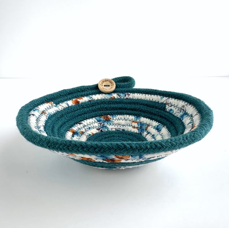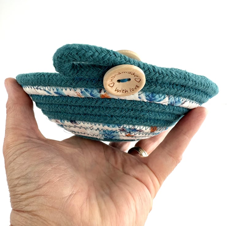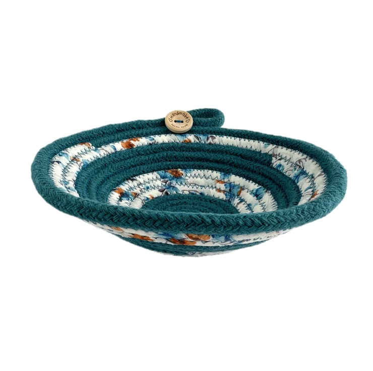 Small teal rope bowl. This lovely little trinket bowl has been made from cotton rope, which has been coiled, whilst being stitched on my sewing machine, and formed into a bowl shape. During this process, sections of the rope have been wrapped with strips of fabric, adding a pretty striped effect to the finished dish. The rope is a gorgeous teal colour, and the fabric is cream with a terracotta, blue and grey floral pattern. The dish has been finished with a decorative loop and two wooden buttons, one on the inside and one on the outside of the bowl. The natural wood buttons are inscribed with the words “Handmade with love” and two tiny hearts.