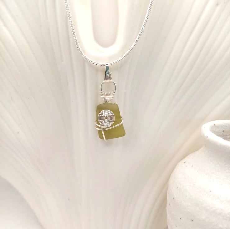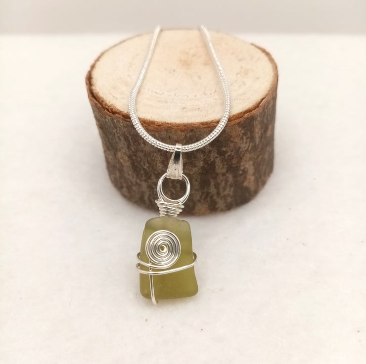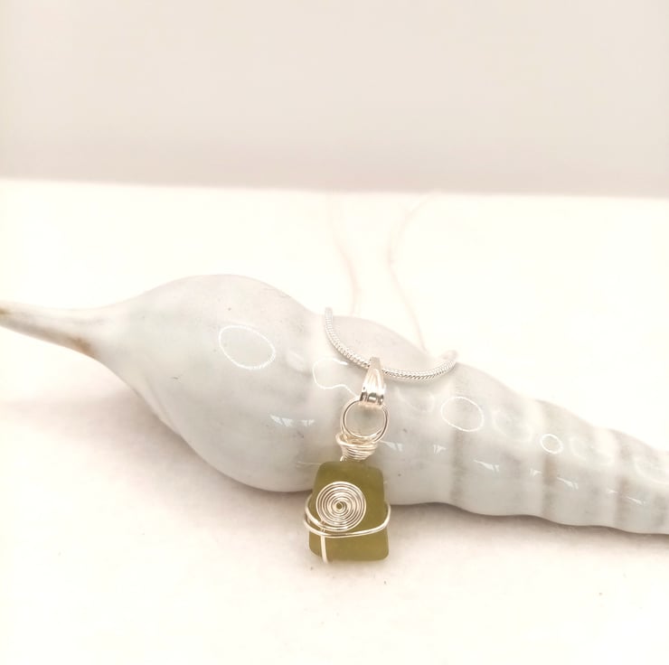 Wire-wrapped sea glass pendant in olive green with silver plated snake chain.