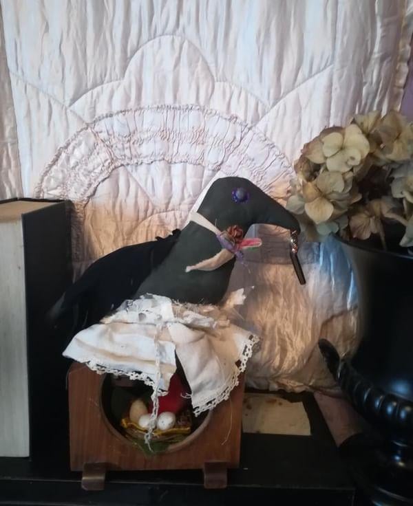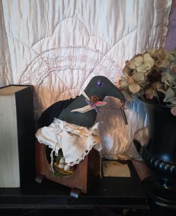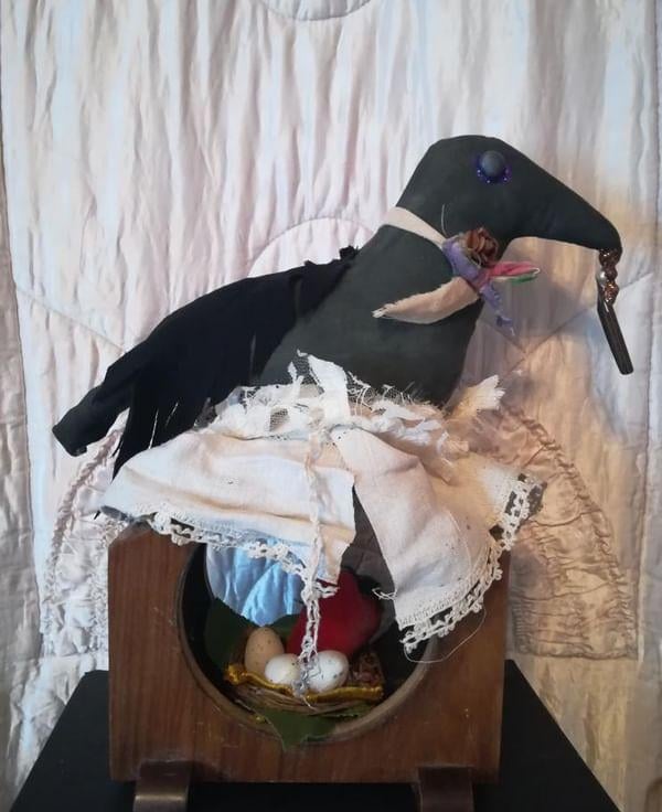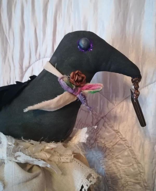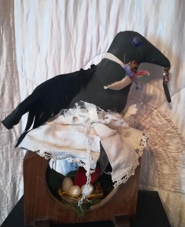 I added vintage fabric ruffles, vintage fabric wings and glittering details. With pearls and an antique pen nibs held in the beak this piece has a worn looking charm.