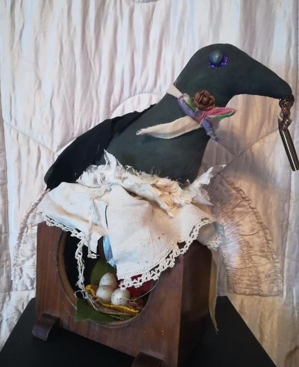 A textile art bird sculpture, I handmade this bird using fabric which I dyed and painted in my primitive folk art style.